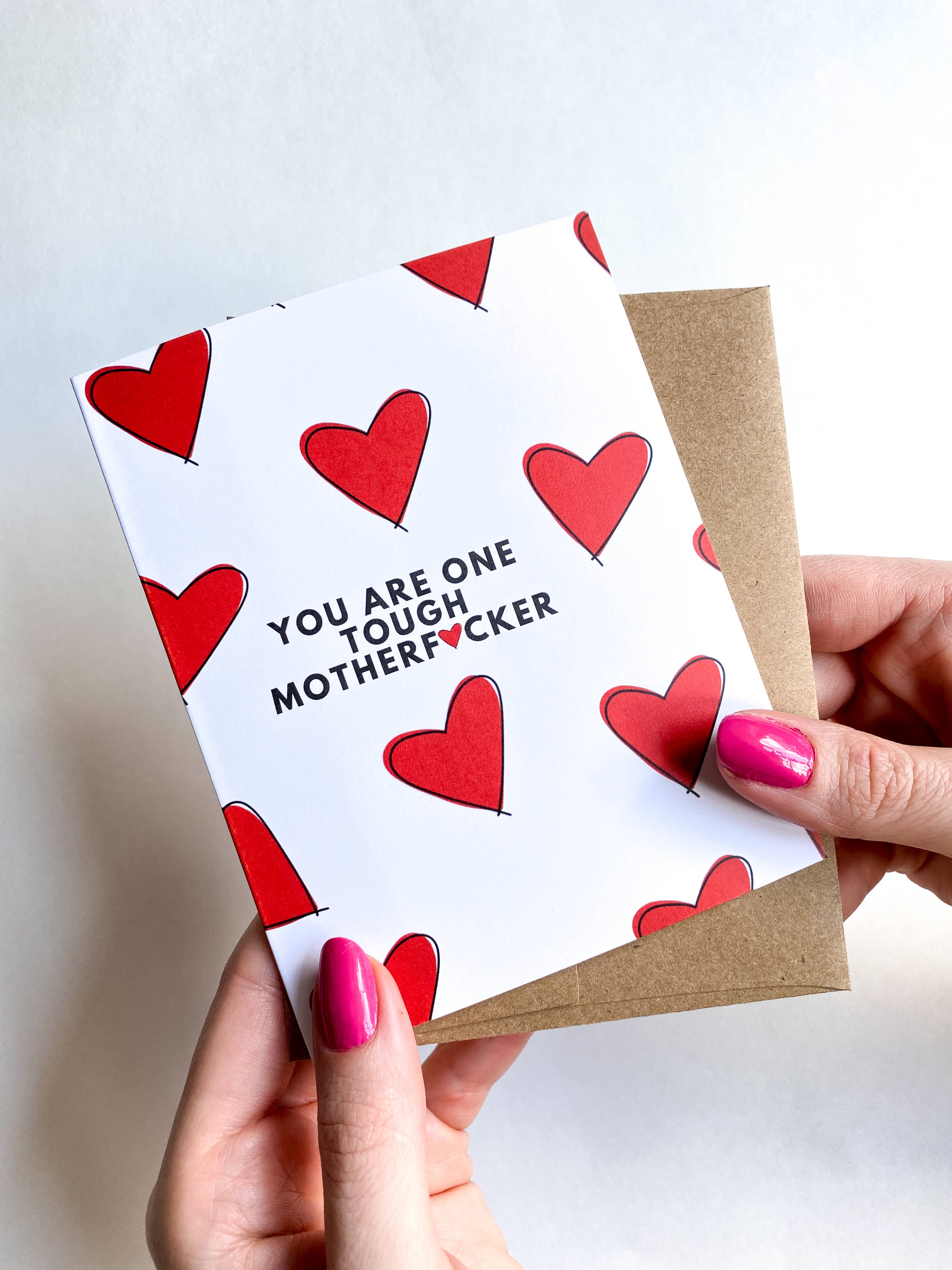 Fuck Cancer Get Well Cancer and Chemo Support Card Details: - BLANK INSIDE - Packaged individually in a crystal-clear no-flap plastic sleeve with a coordinating kraft brown envelope - Ships in 1-3 business days Card Features: - A2 (4 1/4 " x 5 1/2 ") Folded Greeting Card - 120# Cover Uncoated Smooth White Cardstock Envelope Features: - A2 (4 3/8" x 5 3/4") 80# Plain Kraft Brown Envelope -30% Post-Consumer Waste Recycled Content - 100% Renewable Energy Production Thank you for your business! xo, Jess Five Dot Post
