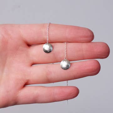Catch that soft, calm moon energy with these large Moon Halo Threaders. The hammered silver glow is beautiful and the u-bar threader style is easy to use! Simply put the end of the threader into your piercing like a post earring and pull through till the u-bar sits in place like an earring hook! 1 1/8" x 2 1/4" - Sterling Silver Handmade in Columbus, Ohio