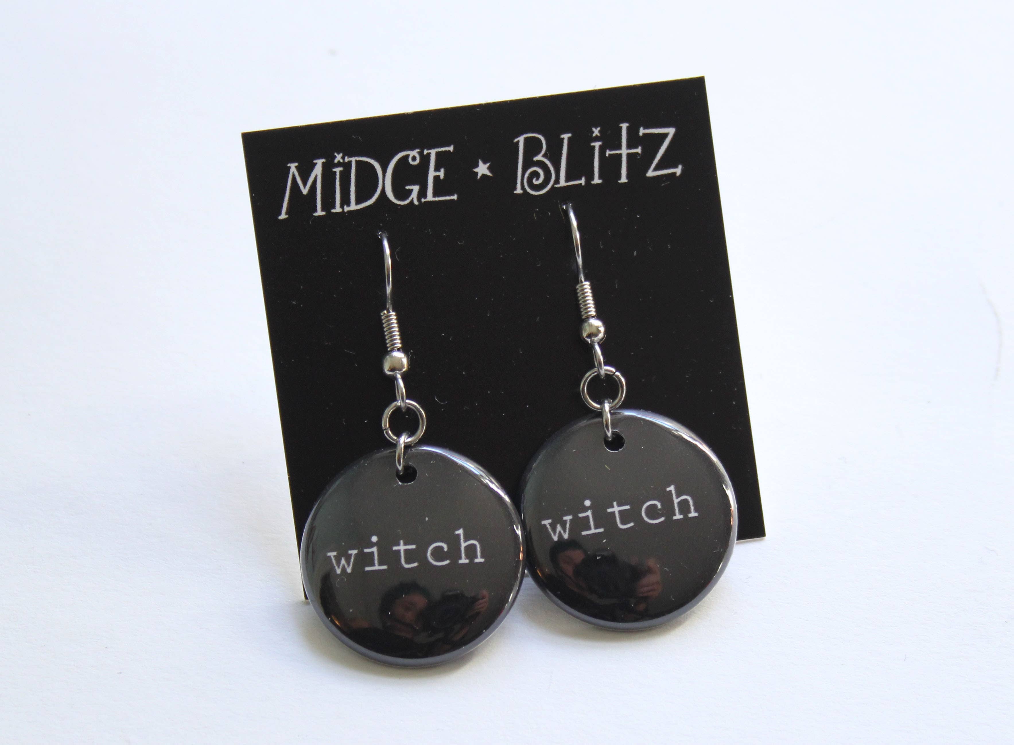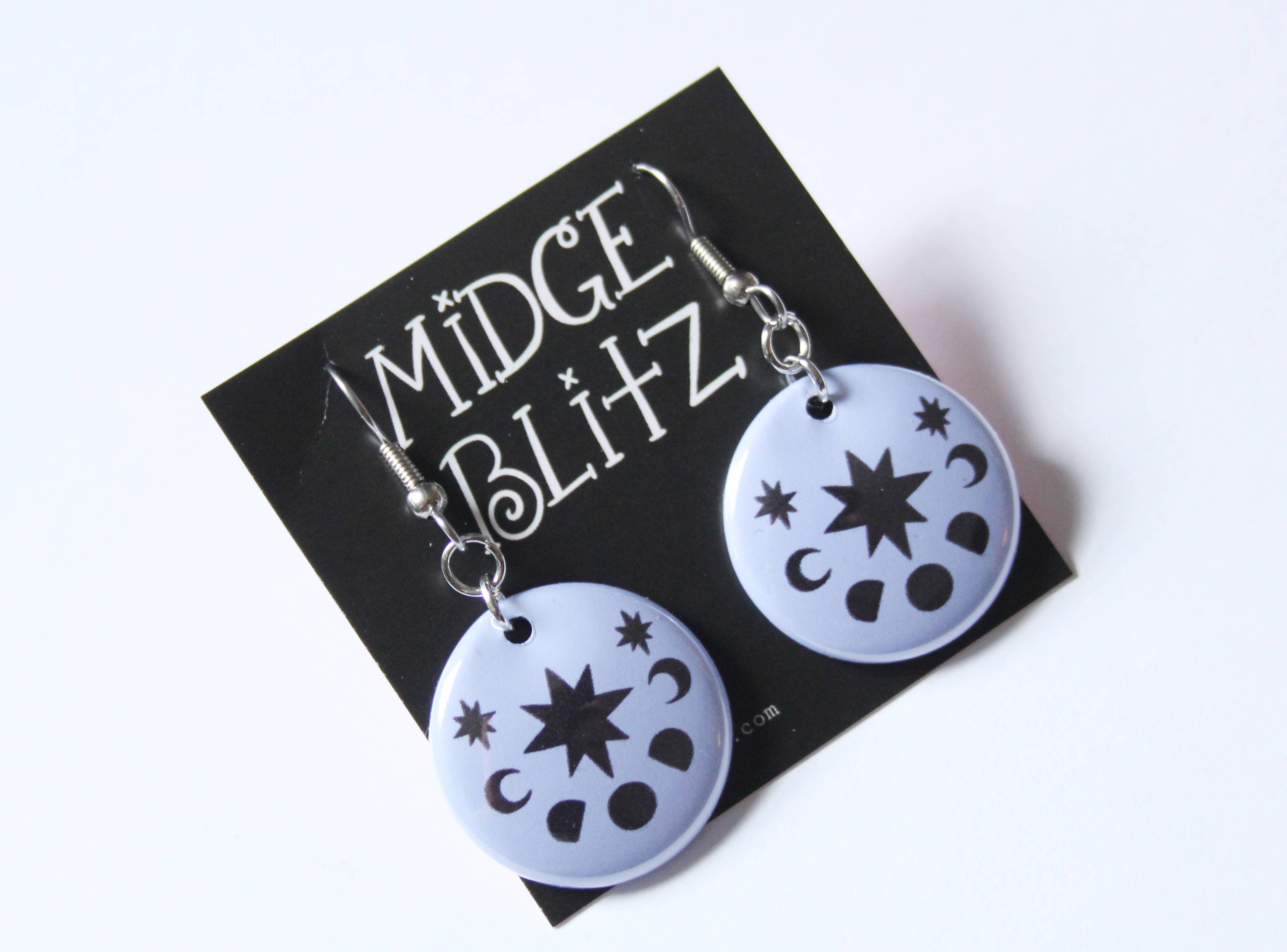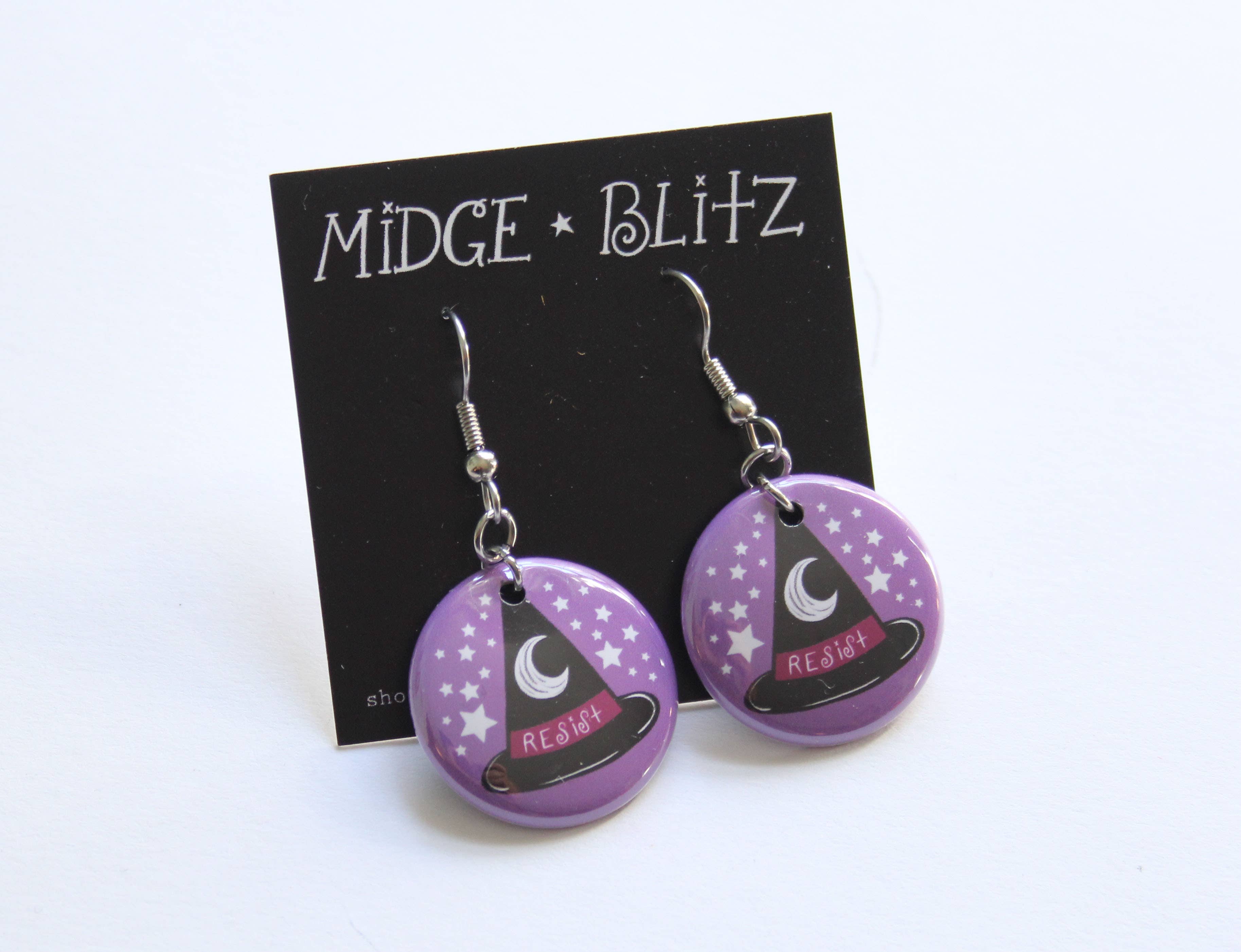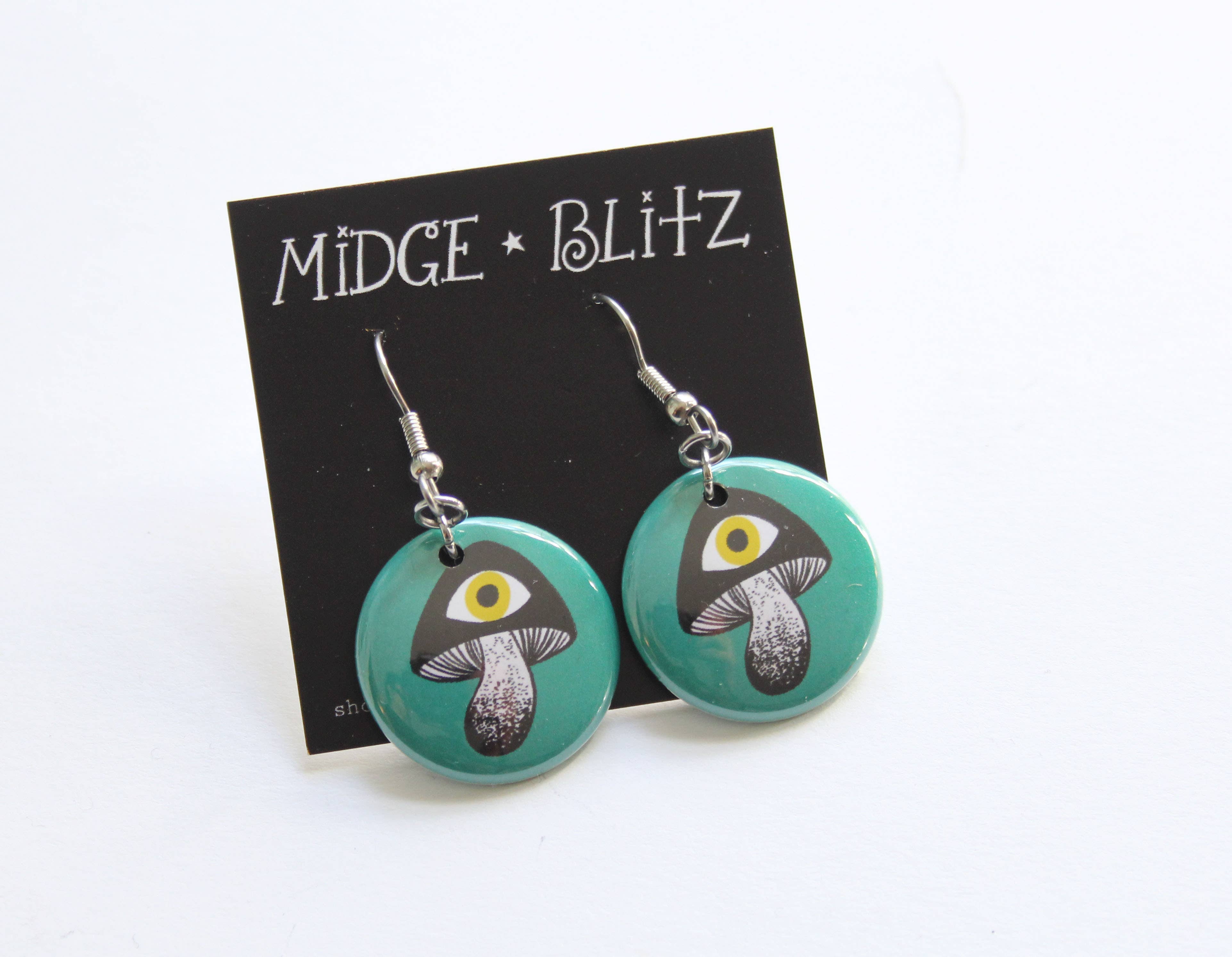 A high quality Mylar protected print of my original design on one inch dangle earrings. Surgical steel French hooks attached.