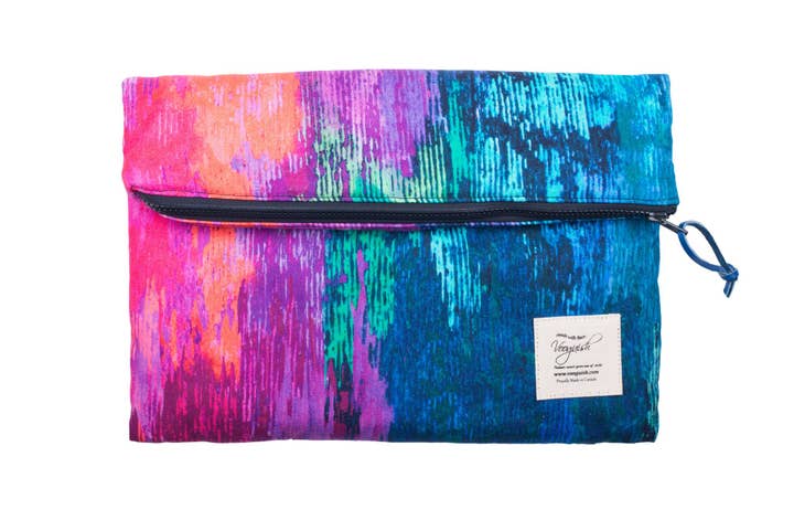 Dimensions: 15.3" x 10.3" / 13.3” x 8.3". 1 Main compartment with small hidden pocket. Cotton woven label. Exposed plastic zipper. pebbled leather pull. Padded lined interior. Magnetic sealing snap.