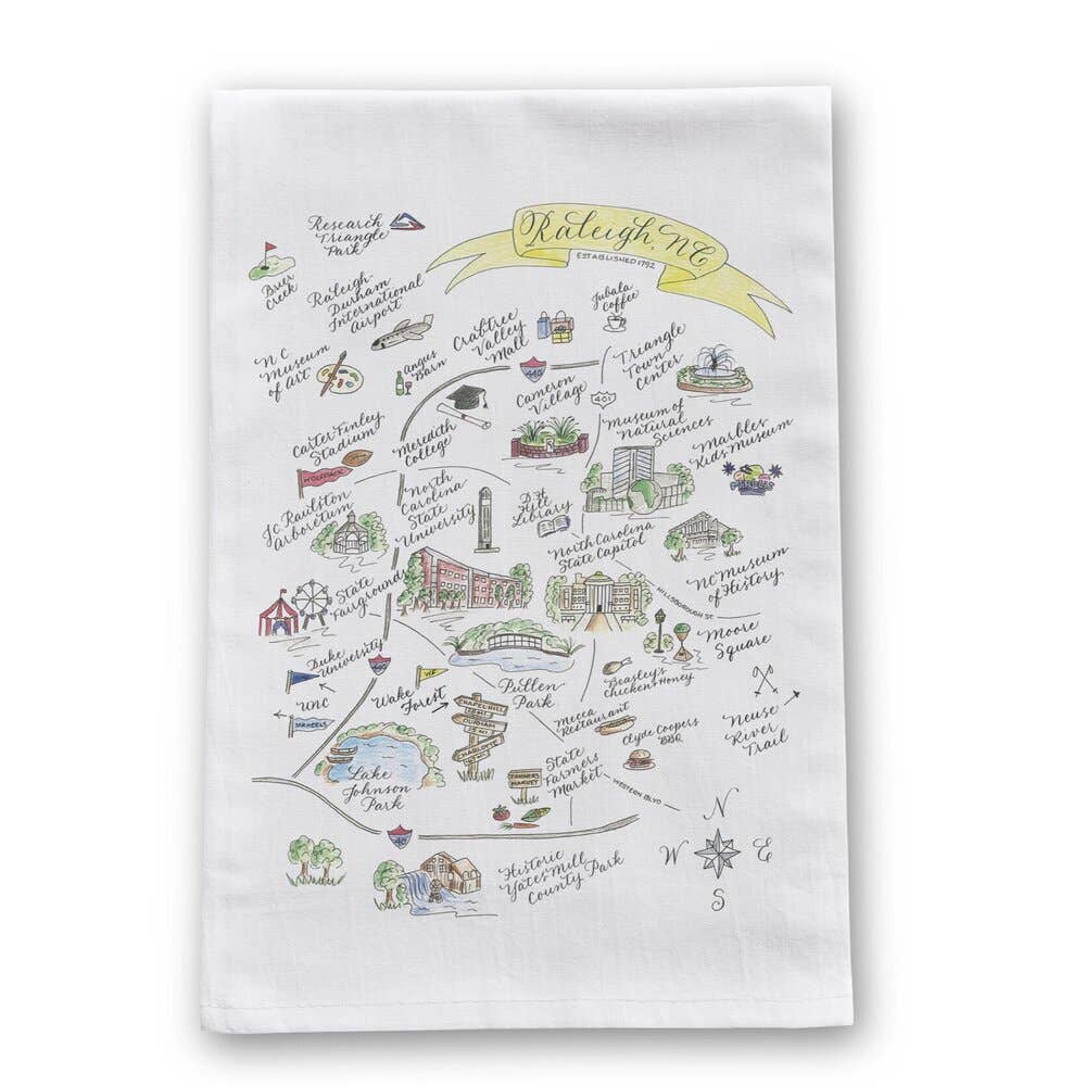 The unique regions of the great state of South Carolina, each drawn, labeled + screen printed in two colors onto washable lint-free floursack cotton kitchen towels. These tea towels only get better as you wash them - perfect for drying dishes or just making your kitchen look awesome. They make a really great gift! Each 100% organic cotton tea towel measures approximately 26" x 26". Machine washable (not with bleach), tumble dry, do not iron.
