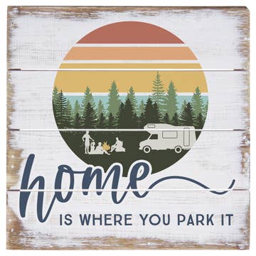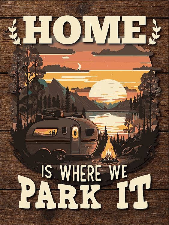 Home is where you park it! This unique indoor outdoor sign is printed on weather-resistant plastic with UV bonded inks, making it perfect to display on any RV or mobile home. Keyhole for hanging. MADE IN THE USA