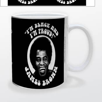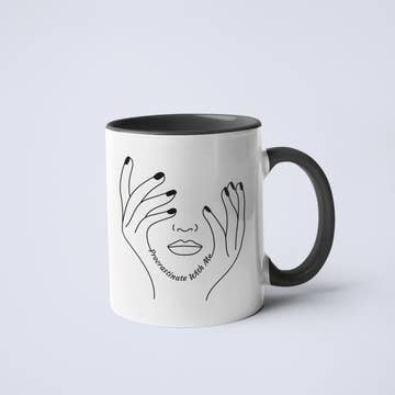 Double sided print. Top rack dishwasher safe. Microwave safe.. Off white with a black rim and handle. Made of ceramic.