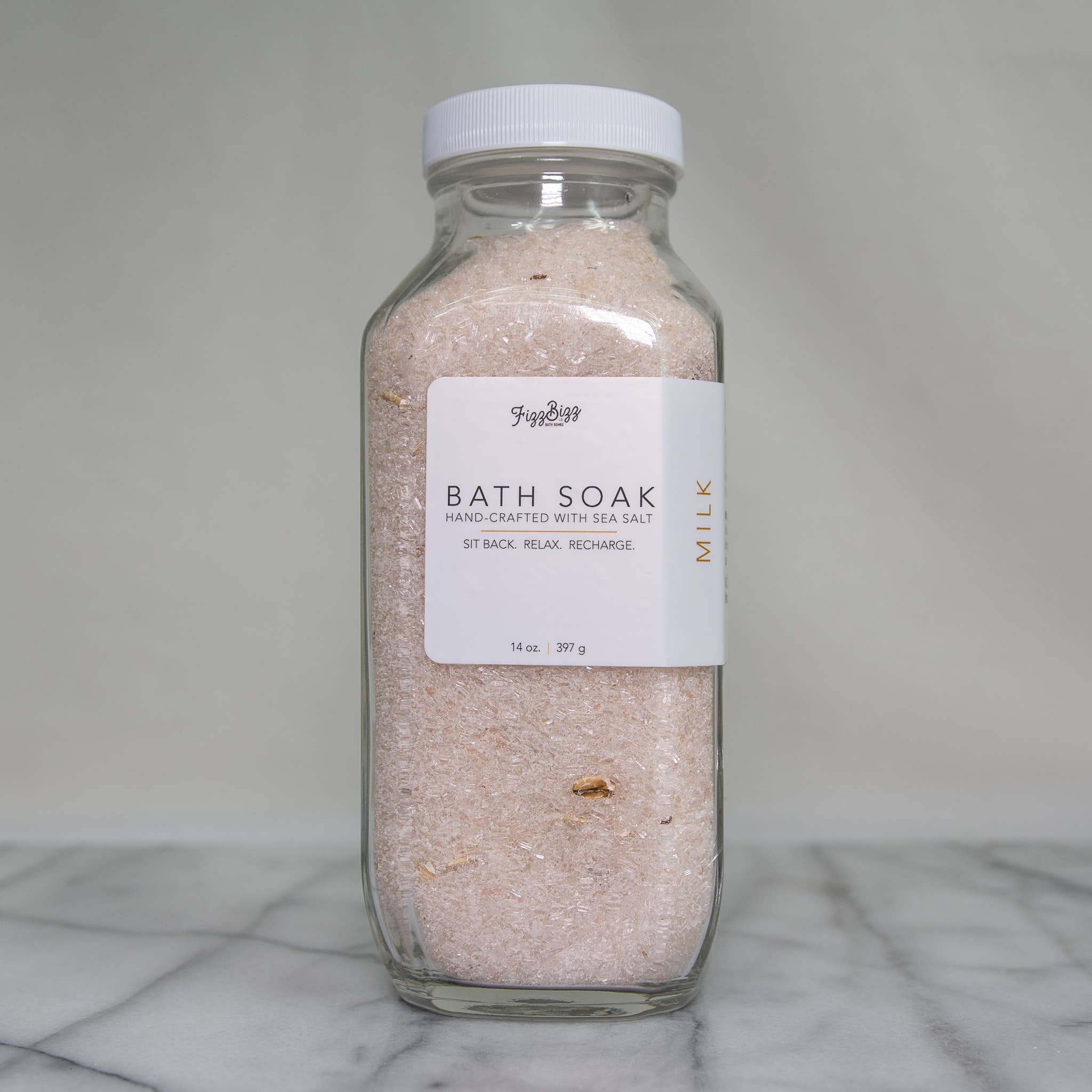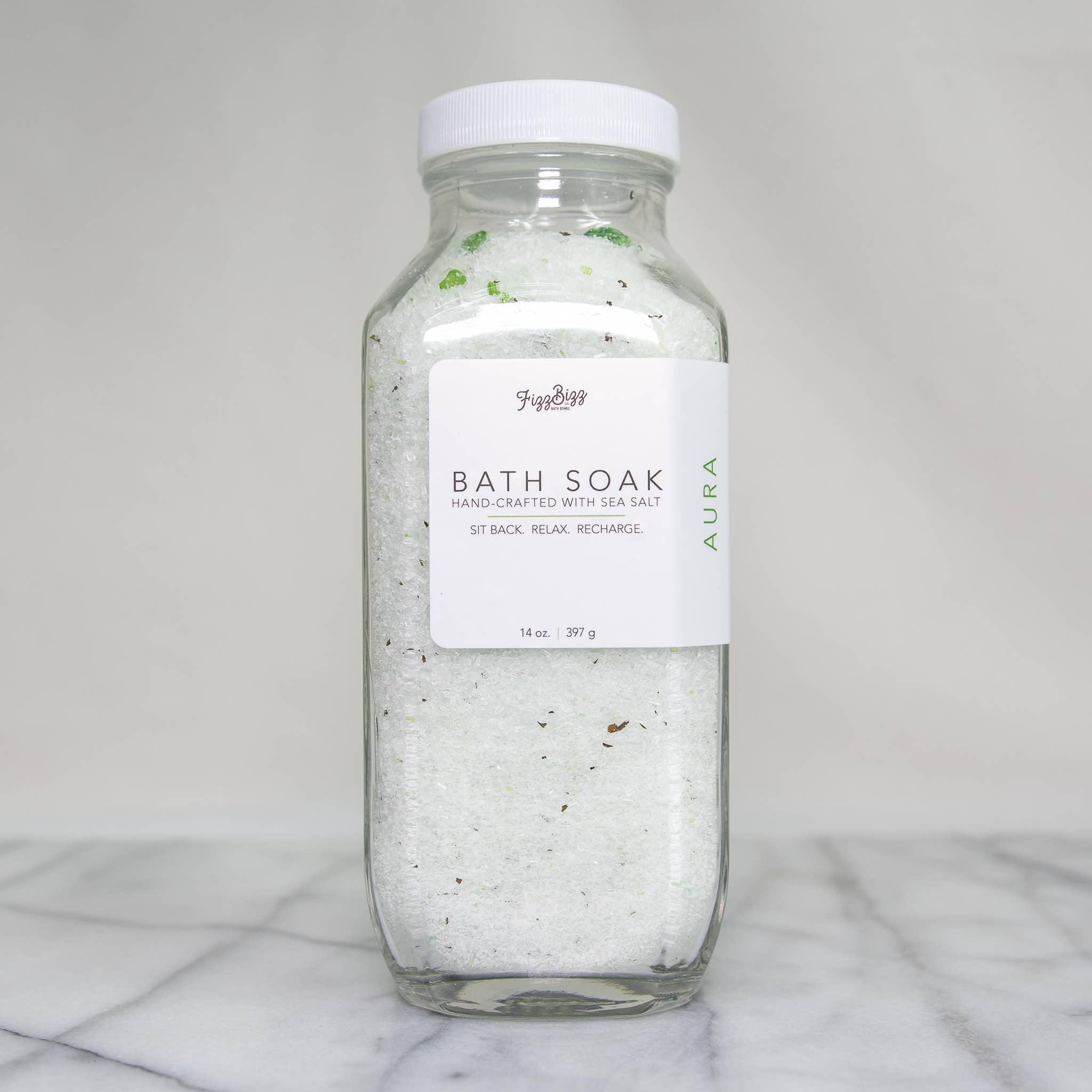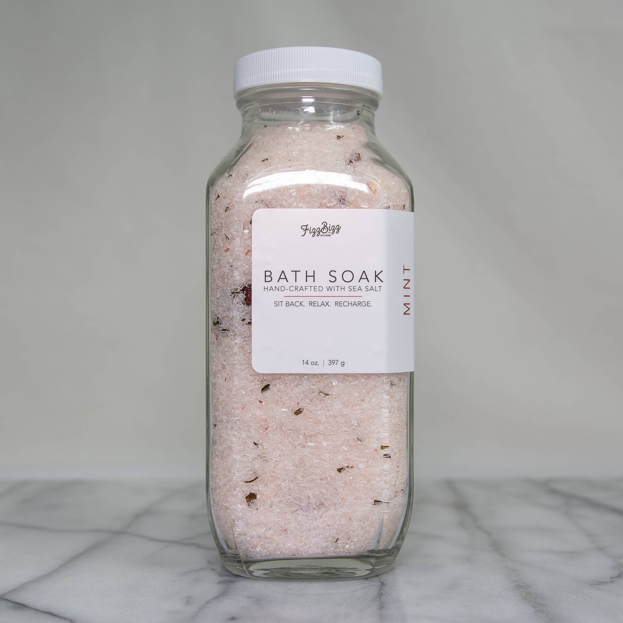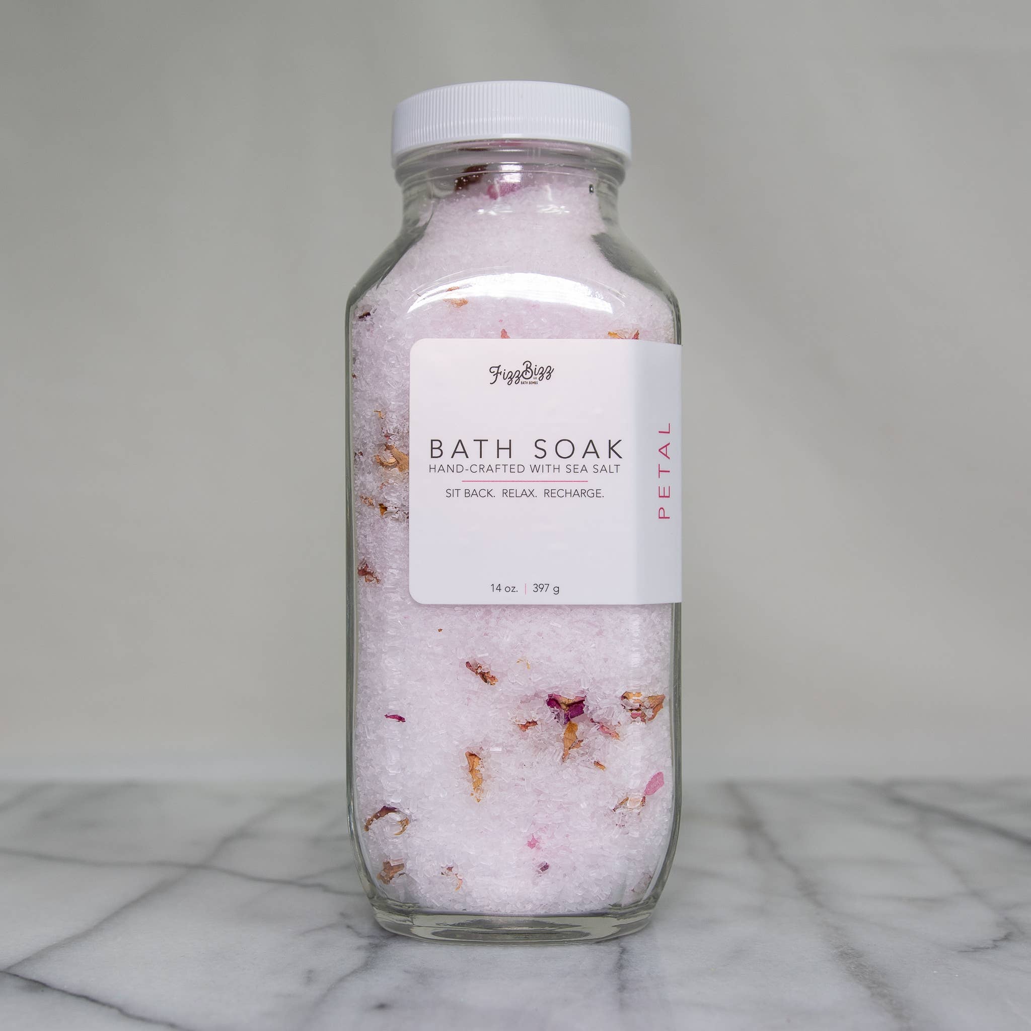 Say hello to our new Premium Bath Salts. What a great way to soak and forget about your day! Sit Back. Relax. Recharge. Ingredients: Magnesium Sulfate (Epsom salt), Dendritic Salt, Sea Salt, Citric Acid, Sodium Bicarbonate (Baking Soda), Lavender, Essential Oil Directions: Pour desired amount into bath, but more importantly, RELAX Size: 14 oz (397g) Jar Size: H 7" x W 2.75" x D 2.75" Jar is made of glass with a white plastic lid.