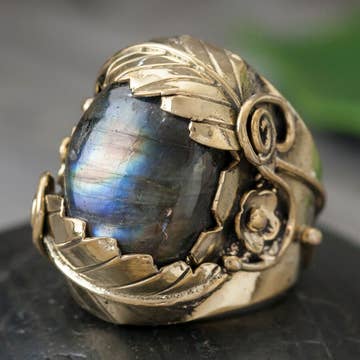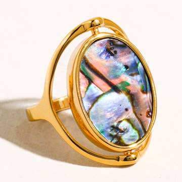 Inspired by the mystical Northern Lights, this collection is inspired by a new day illuminating a fresh start. A flashy paua shell prong set in brass on our signature hand carved ring. Width 5/8" Height 3/4" This piece is handmade-to-order. Each piece will vary slightly due to the uniqueness of the stones. All metal is nickel free. Materials: brass, metal, semi-precious, precious, stone, gemstone, recycled.