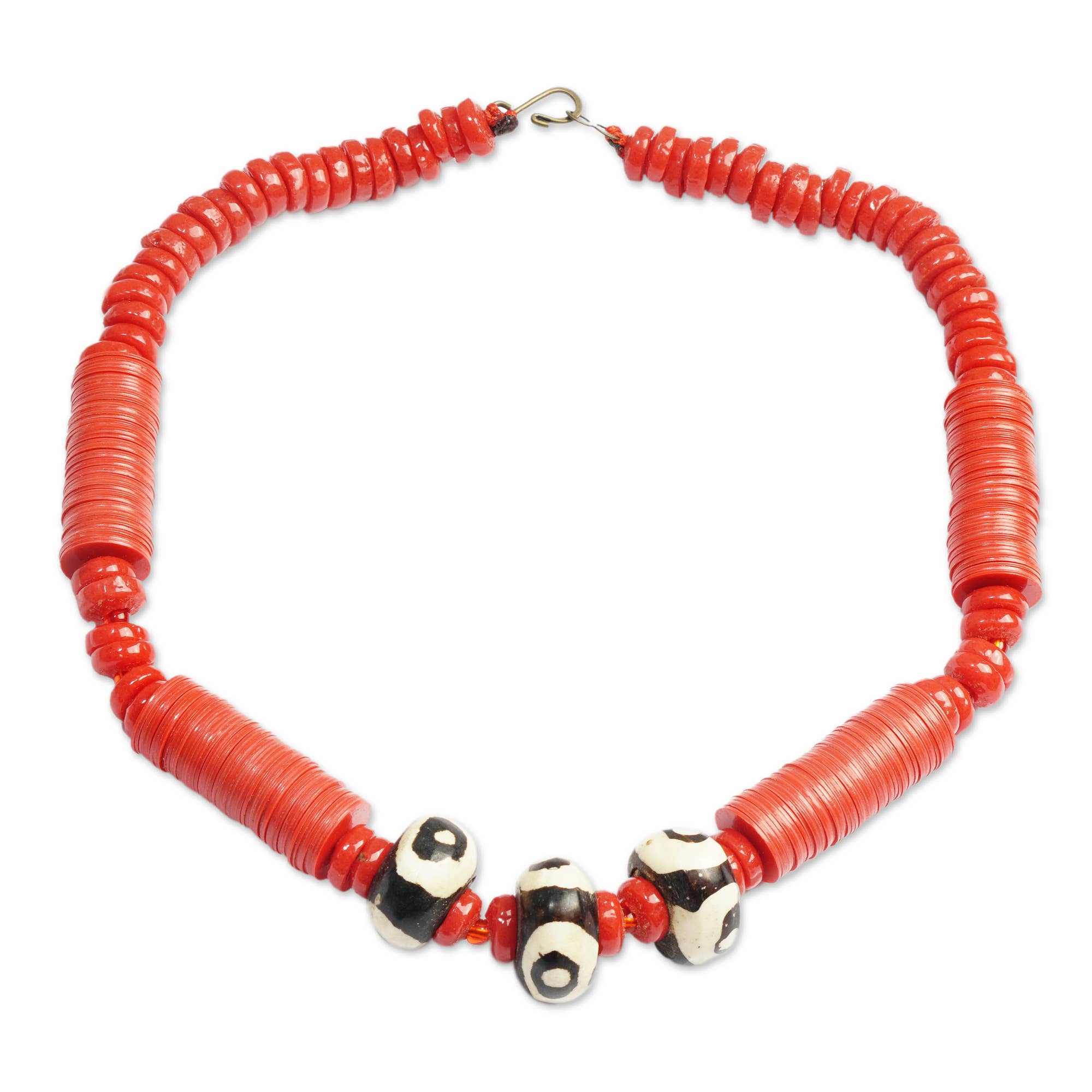 Red wooden checkers that have been altered and adorned with oxidized brass stamens are cold joined to oxidized brass stems. A cast and antiqued brass bee hovers on an 18" cable choker with magnetic closure. A modern, lightweight necklace that is a great conversation piece Fabricated. Pendant-3 x 2.5"
