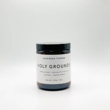 Holy Grounds is an exfoliant made with ingredients known to prevent fine lines and cellulite, tighten pores, promote blood circulation, reduce redness, exfoliate dead skin cells, and moisturize the skin. Can be used after shaving for a softer finish. **Now in amber