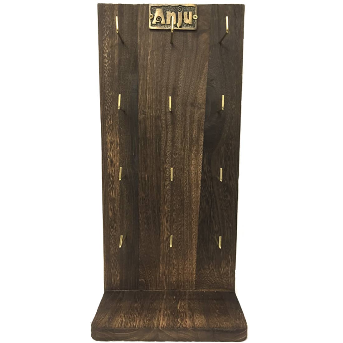 Four-sided wooden spinner display. Two panels with 3 hooks for necklaces, one panel with 16 bracelet slots (2" high, 3" wide, 2.25" deep), and one panel with 6 hooks for earring cards. Spinner base. No jewelry included. Unit dimensions 21" x 8" x 8"