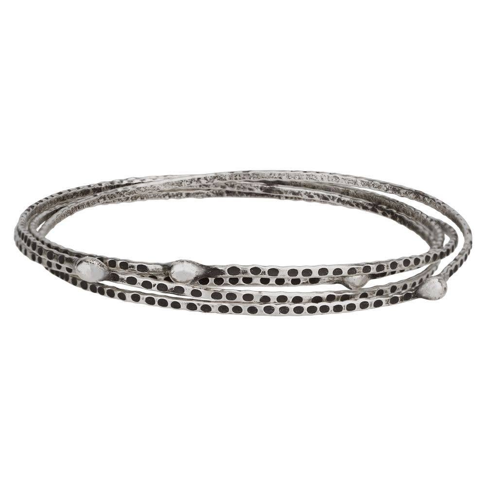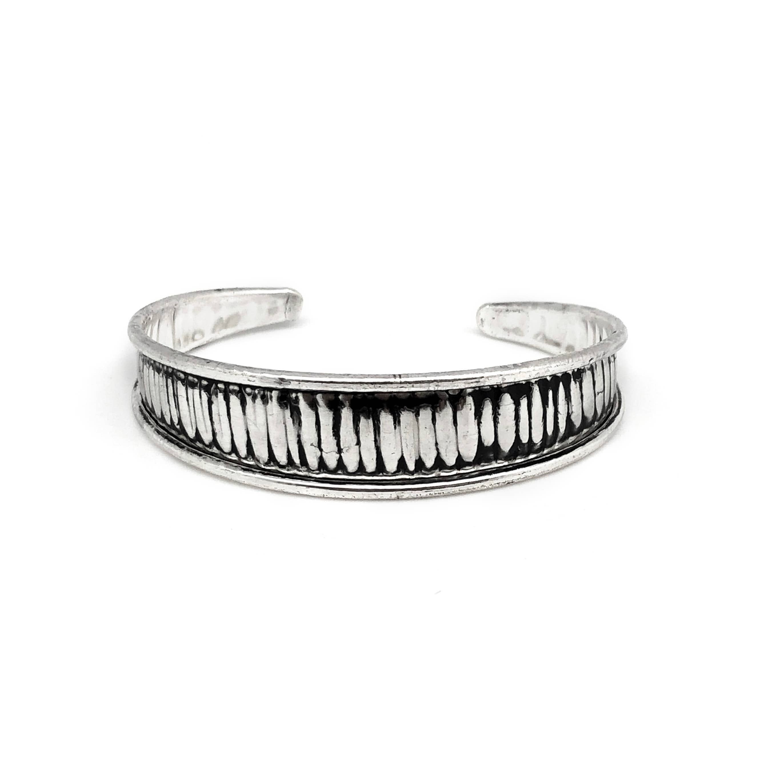 Classic boho chic design in silver hammered metal. This silver cuff features 4 lines of hand hammered metal accented with raised dots giving rustic texture to this basic bracelet. An ideal bracelet for daily wear and a great addition to any festival look. Handmade in India Textured silver metal cuff bracelet Measurements (approx.): 3/4" wide Materials: Silver-tone Metal
