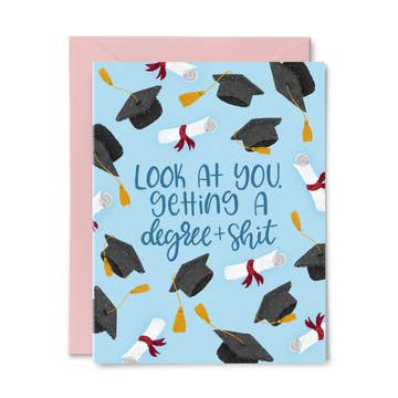 Movin’ on up from the boxed wine! // OUTSIDE: you graduated from boxes to bottles! INSIDE: blank for hoorays, CARD SIZE: (A2) 4.25 x 5.5”, MATERIALS: 110 lb recycled paper + recycled kraft envelope