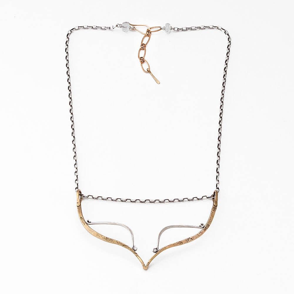 Brass with sterling silver. 2 1/2" width. Textured brass band with sterling silver accent, slightly adjustable.