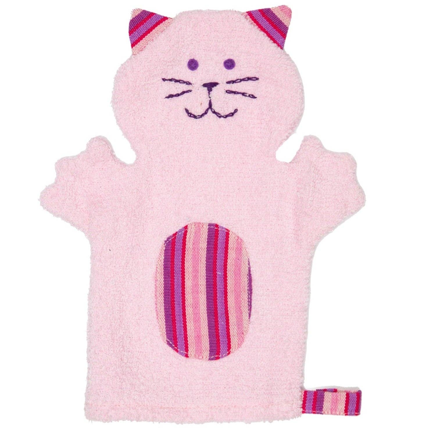 Your little one will have a hopping good time with this new bath time amigo! Each bunny puppet is made with soft terry cloth and features coordinating Guatemalan fabric accents. Handmade and fair trade! 13" x 7". 100% cotton terry cloth. 100% cotton accents. Assorted colors.