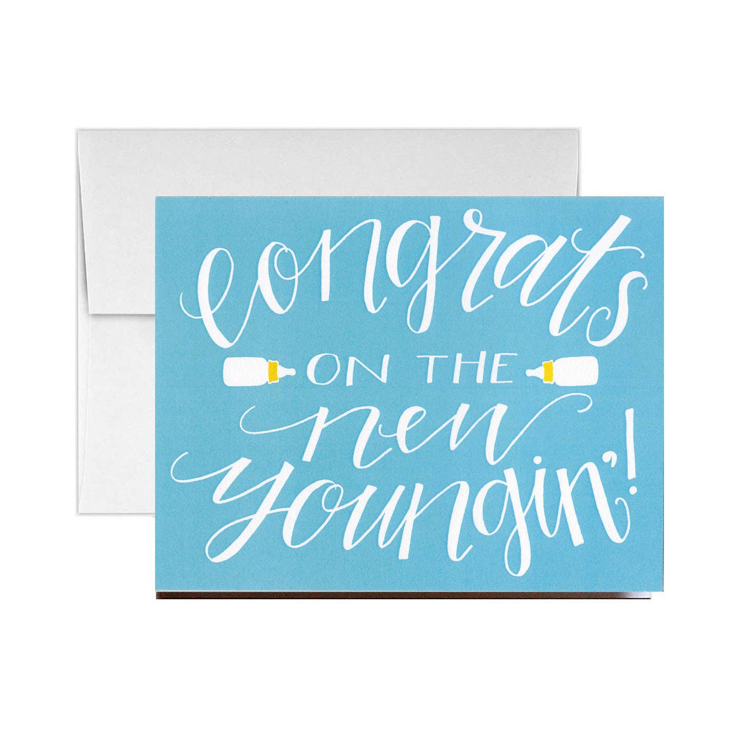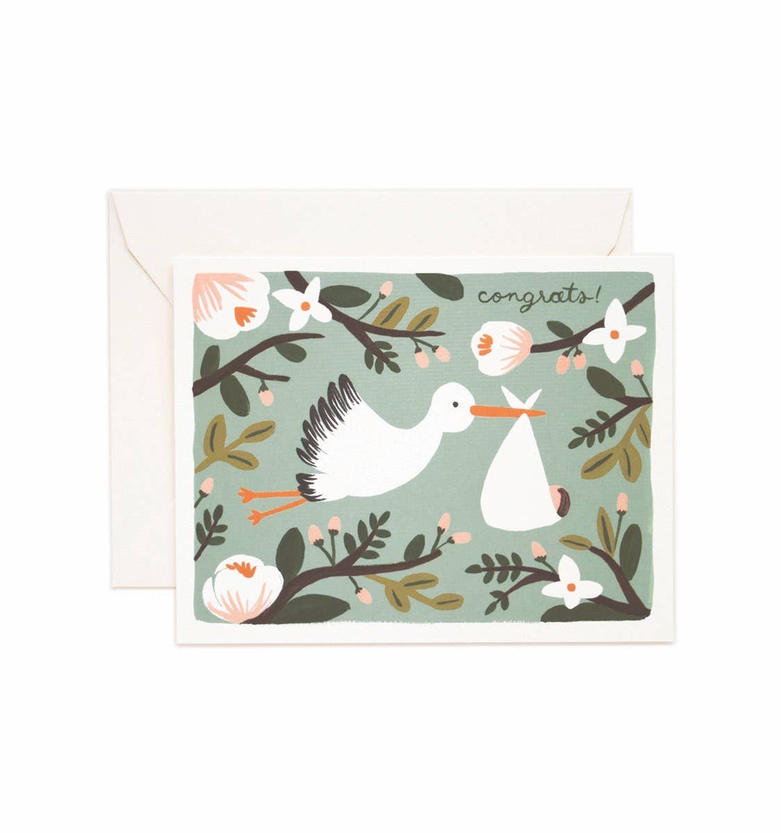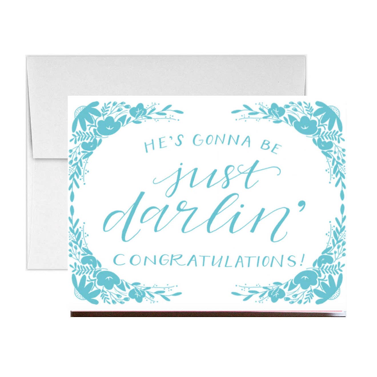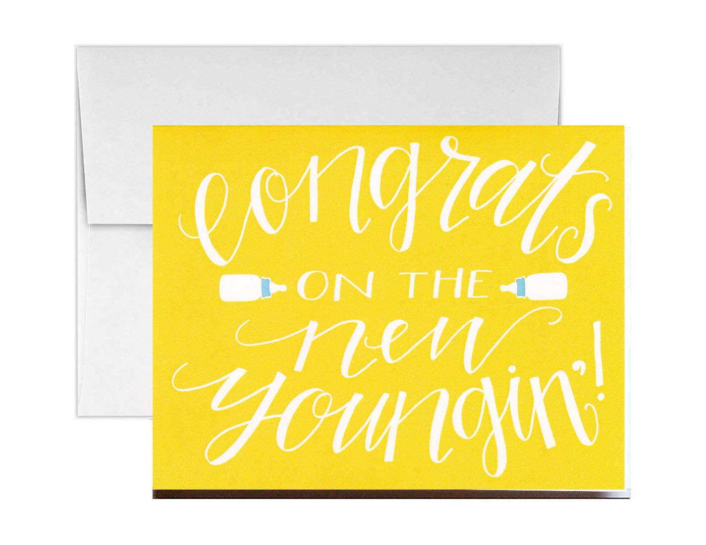 A2 (4.25” x 5.5”). Flat printed in Birmingham, Alabama on 120 lb. uncoated paper. Packaged in a cello sleeve with a coordinating envelope. Blank inside.