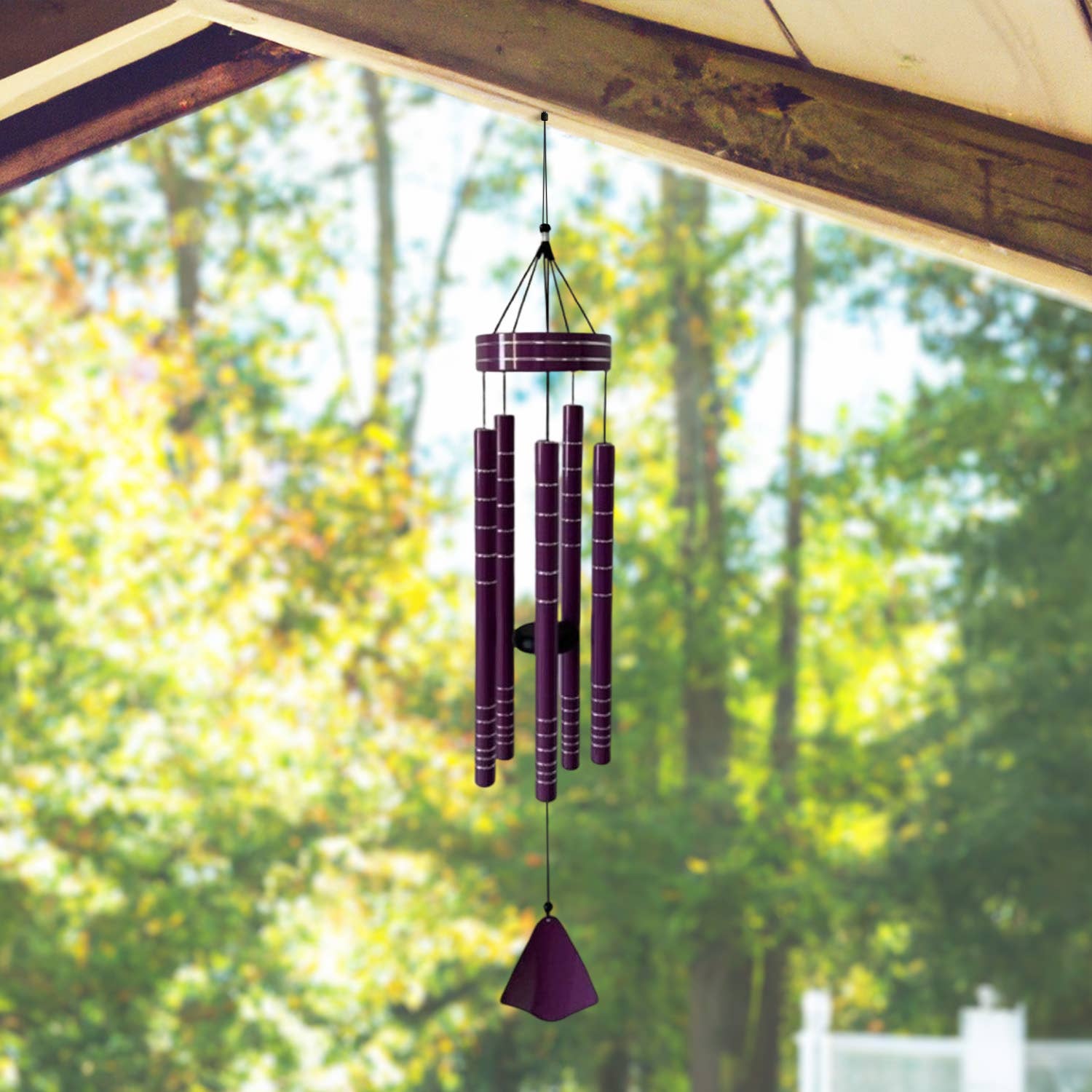 Aestheticism with functionality, the Peaceful wind chime from Sunset Vista Designs exudes a classical style in beauty and in tone. Handcrafted with anodized aluminum tubes, solid wood & durable nylon braided cord. Six, deep bronze harmonizing tubes balance below the solid wood octagonal suspension platform. Each gentle breeze produces a blended tenor tone. The solid wood sail is blank so it can be personalized. Made with rust-resistant, anodized aluminum, wood & durable nylon braided cord. Each tube provides a joyful resonating note. Includes easy hanging metal hook. Makes a great gift for any season or reason!" Measures approximately: 6.25" x 6.25" x 42"