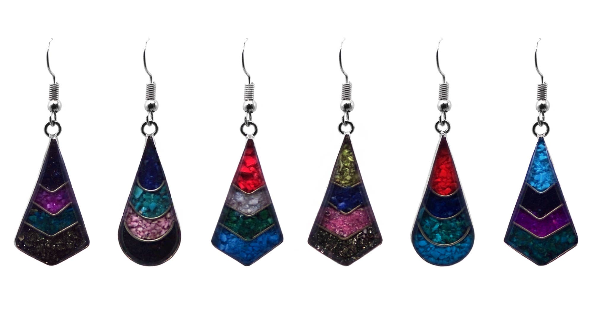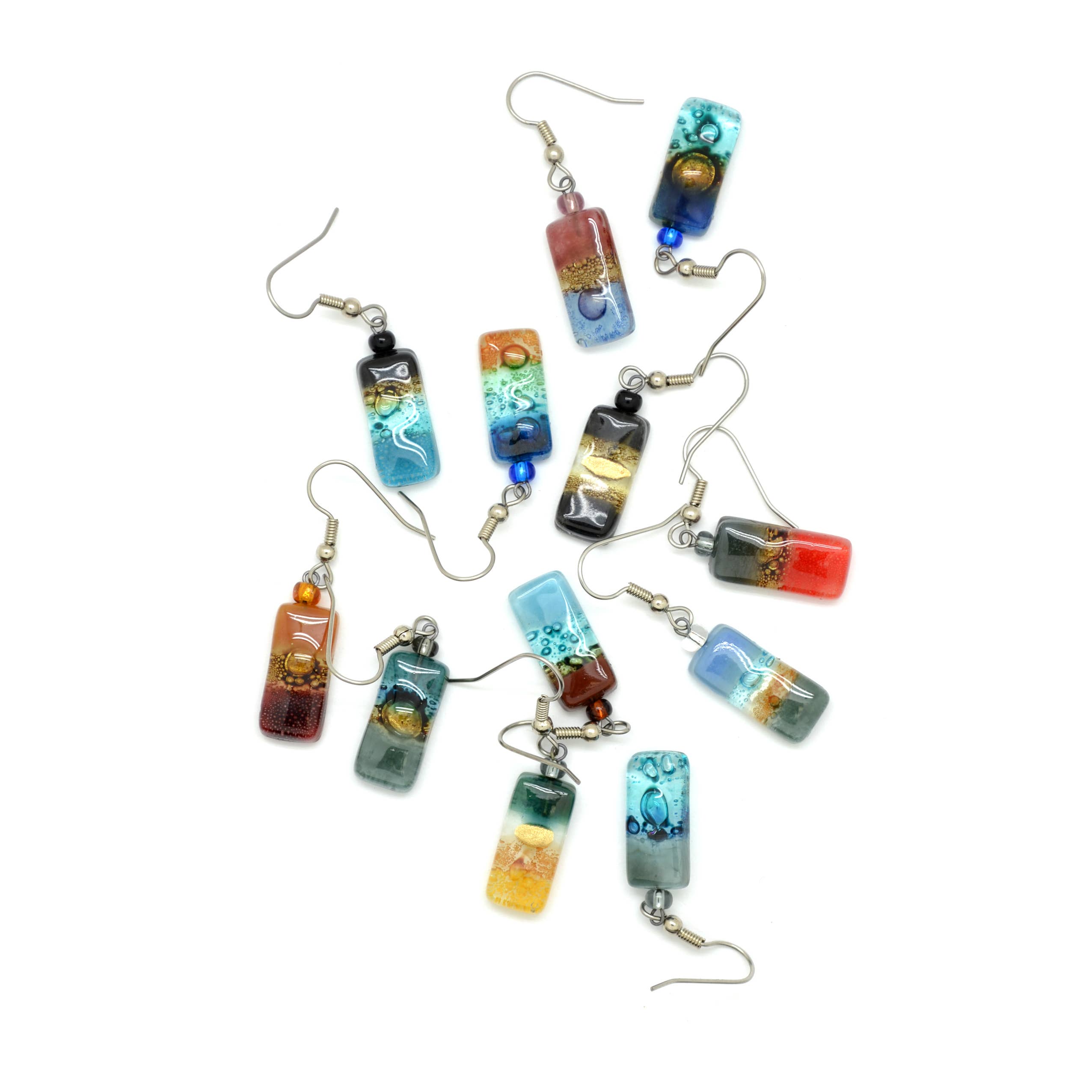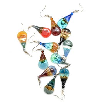 Fused glass teardrop earrings. These are a classic and we think they make a great gift for mothers, teachers, art lovers or artists. What do you think? Dangle 1-1/4". Made with fused glass, glass beads and surgical steel ear wires. Fair Trade verified Ships in assorted colors of the season. Please look at all of our photos to see examples of our work. If you have questions, please ask. If we're between seasons, we can typically ship assortments with appropriate colors.
