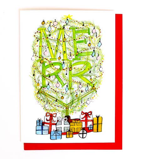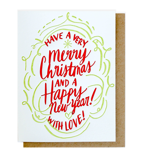 Our Christmas With Love letterpress card features a hand-drawn holiday illustration. It includes the phrase “Have a very Merry Christmas and a Happy New Year with love!”