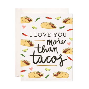 You love beer. You love tacos. But you love your person just a little bit more! Perfect for Anniversaries, Valentine's Day, or Just Because! Blank inside for your own message. Details: Size - Folded A2 (4.25” x 5.5”) Paper - 120 Eggshell Ultra White Single Card with one Kraft envelope Packaged in cellophane sleeve with adhesive sealed side