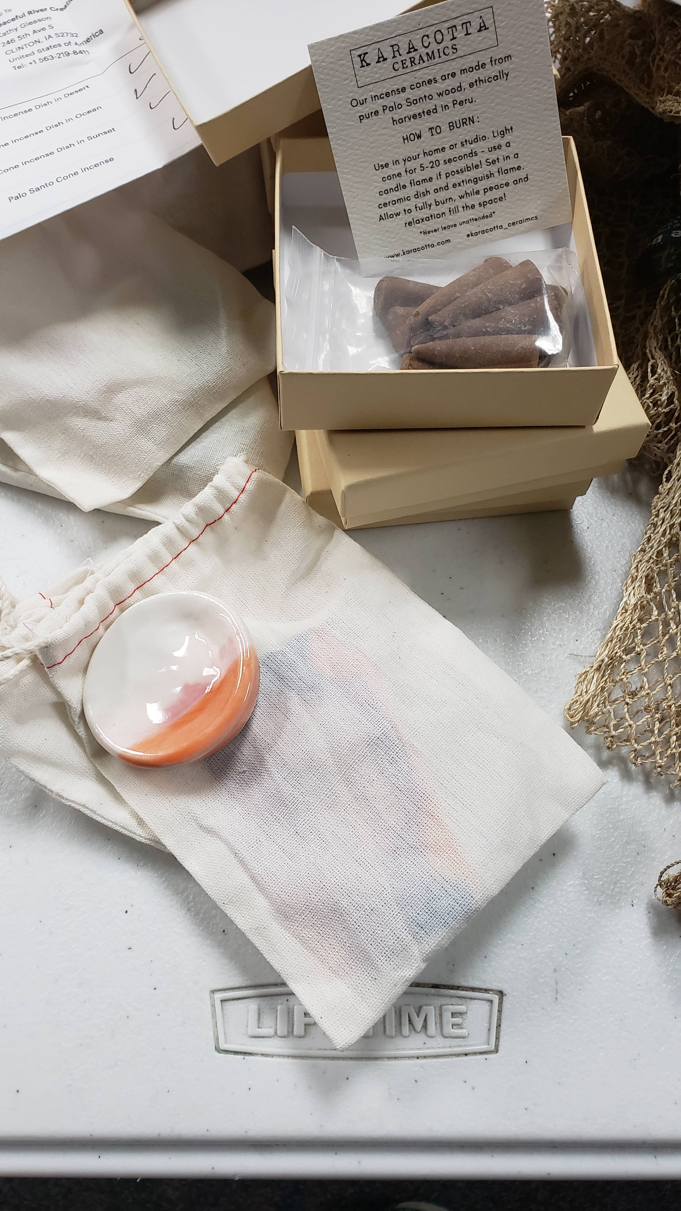 I like that each item is made to order. The palo santo that arrived was very aromatic and soothing as the smell wafted through the air. Then the icing was the hand-made dishes to burn the cones. Each design was simple and eye pleasing. They can easily stay out as a decoration on a table or shelf.