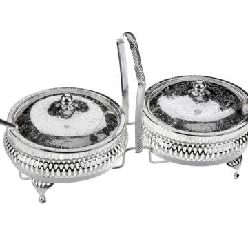 Queen Anne Double Jam with Lids/Spoon Silver Plate 5 3/4"h 4 3/4"w x 10 1/8"l Queen Anne English Silver Plate (Tarnish Resistant). SKU #: 0/4332.