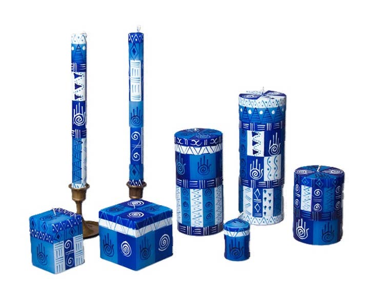 Hamsa Shabbat 4-pack incorporates the protective palm of Hamsa design! *Lovingly hand poured and hand painted in South Africa. *Crafted primarily by single mothers from the local rural community. *On average, the artisans support an extended family of 12-15 people. PRODUCT DESCRIPTION: *4.75" taper/ 4 hour burn time *Highest quality natural paraffin wax with 100% cotton wick *Unscented, smokeless, and free from added toxins *Shabbat tapers packaged in a 4-pack and tied with a story card. CANDLE CARE: *First burn time: 1-hour for every inch diameter *Wicks should always be cut to ¼” prior to lighting *Avoid drafts – they cause dripping! *Ensure candles are extinguished prior to leaving the room