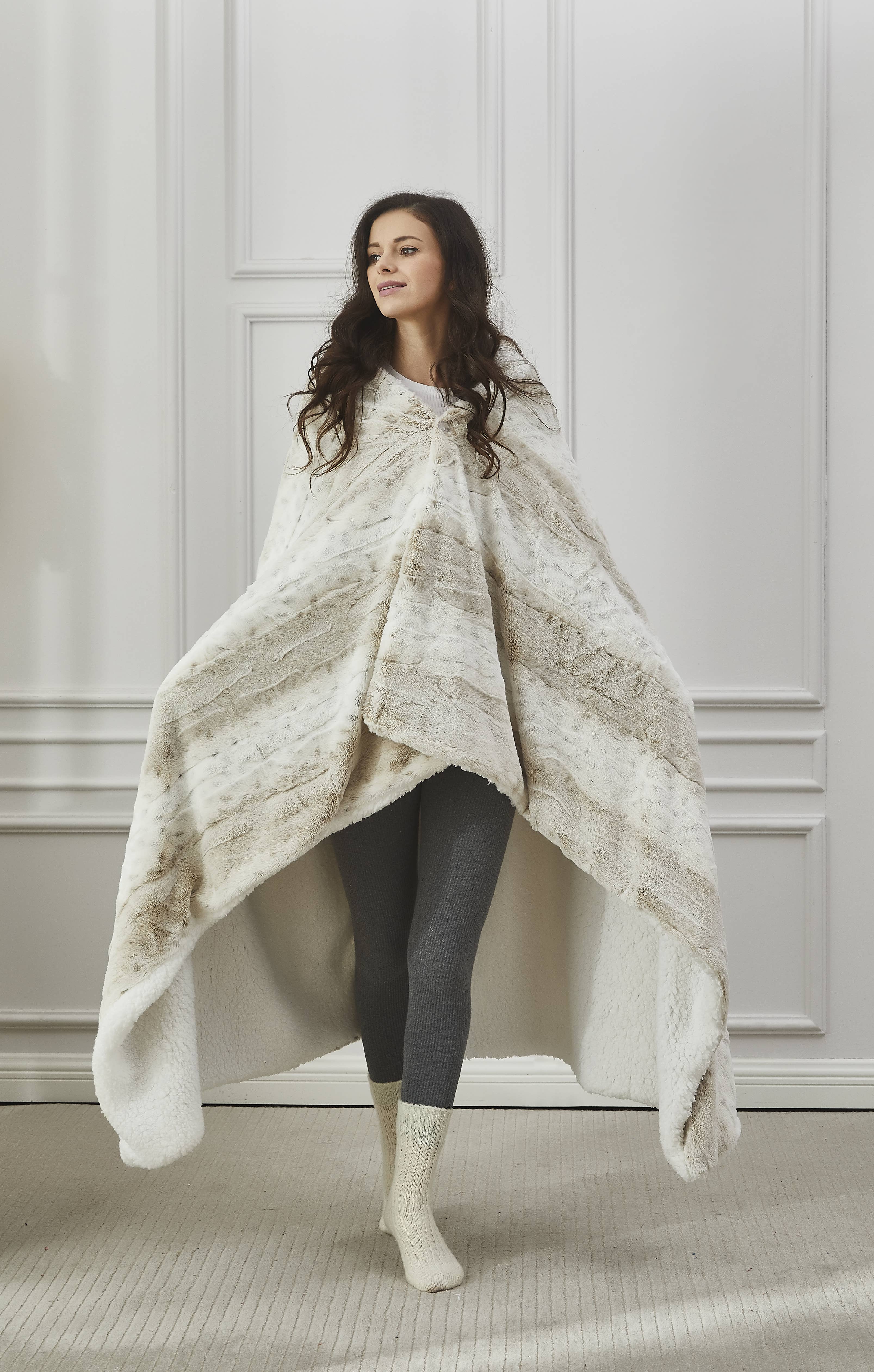 Exceptionally soft faux fur mimics the warmth and texture of real fur, while the marble print gives the throw a beautifully stunning look. The throw is oversized, nearly a foot larger in length and width compared to other throws. Luxuriously indulgent, this faux-fur throw wraps you in irresistible softness and is machine washable for easy care. 60"W x 70"L Face: 100% polyester brushed long fur Back: 100% polyester solid mink
