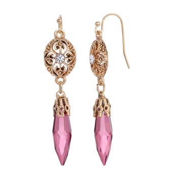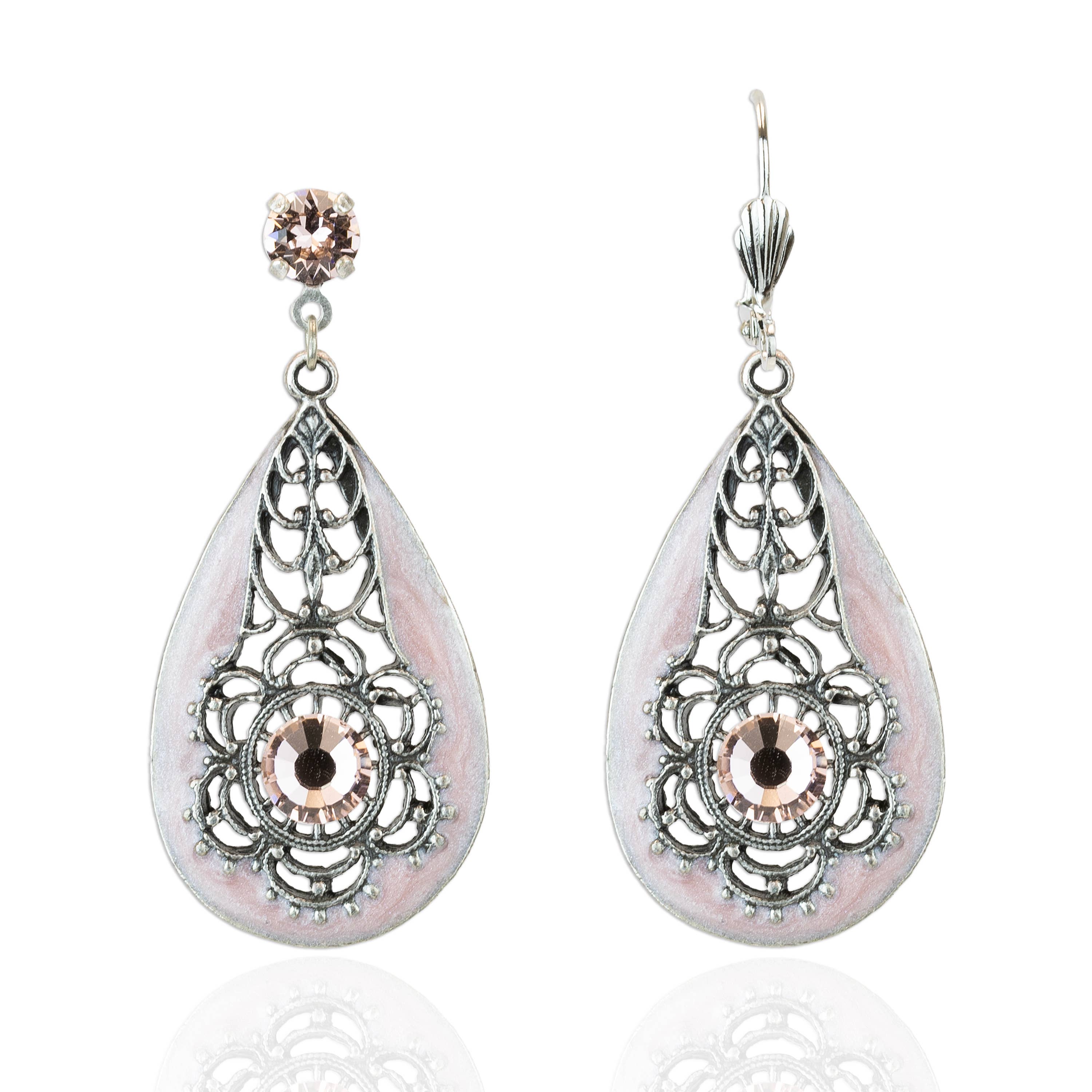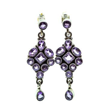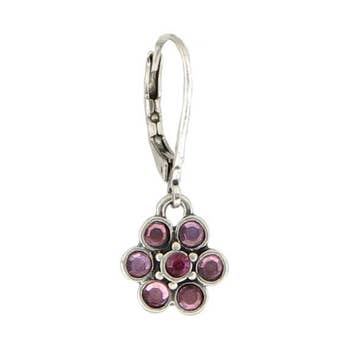 Add some nature inspired beauty with these Art Nouveau influenced dangles. Hand enameled flowers with crystal accents make these a sweet addition to any look. Made in the USA with antiqued lead/nickel free brass findings. Also available with a coordinating crystal clip or post. Earring wires/clips made of nickel/lead free antiqued brass. Posts made of surgical steel. Crystal Color: amethyst Enamel Color: amethyst purple Approximate Measurements from top of earring wire: 1/2" L x 3/8" W Style# ER4820AMY Coordinating Style: NK4820AMY