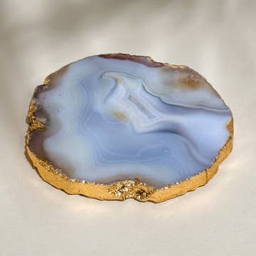 - Set of 4 Agate Crystal Coasters. - Choose from either 'Colors' - an assortment of blue, purple & pink agates - or 'Neutrals' - a mixture of natural, earth toned agates. - Use for beverages, as a tray for jewelry, or burning plate for Sages and Palo Santo. - Rubber feet protect and grip surfaces. - Approximately 3-4" in diameter. - Hand wash.