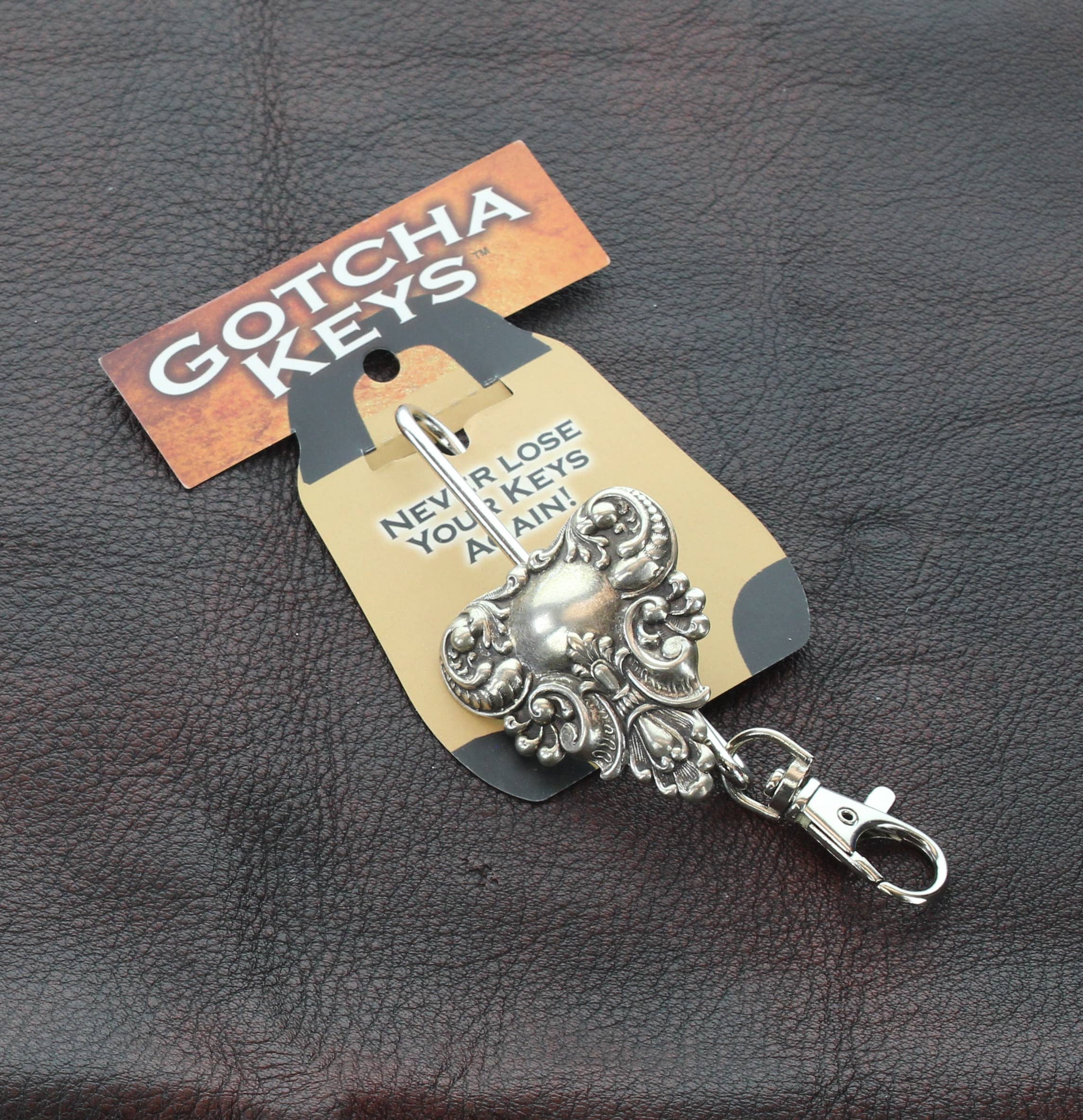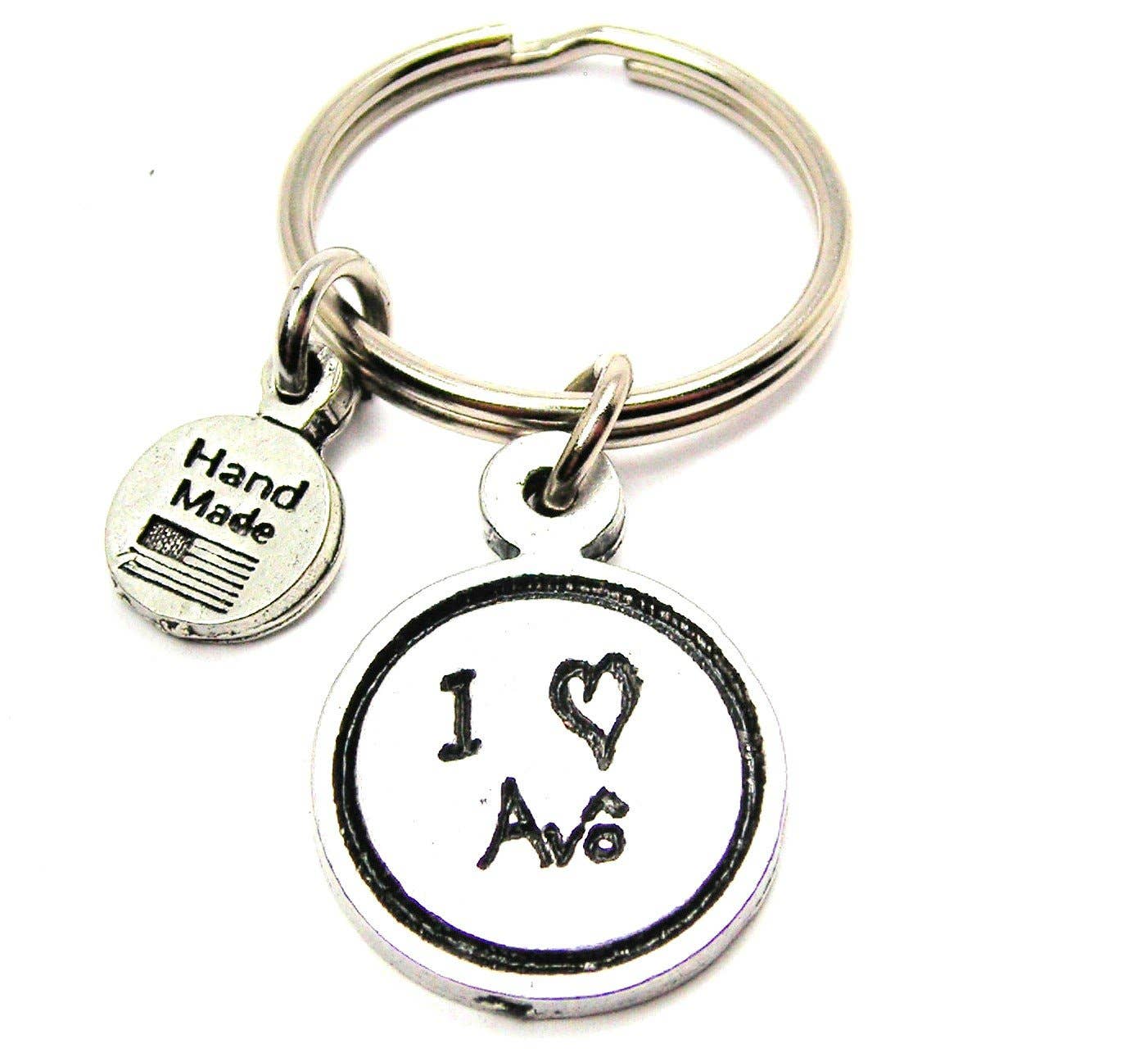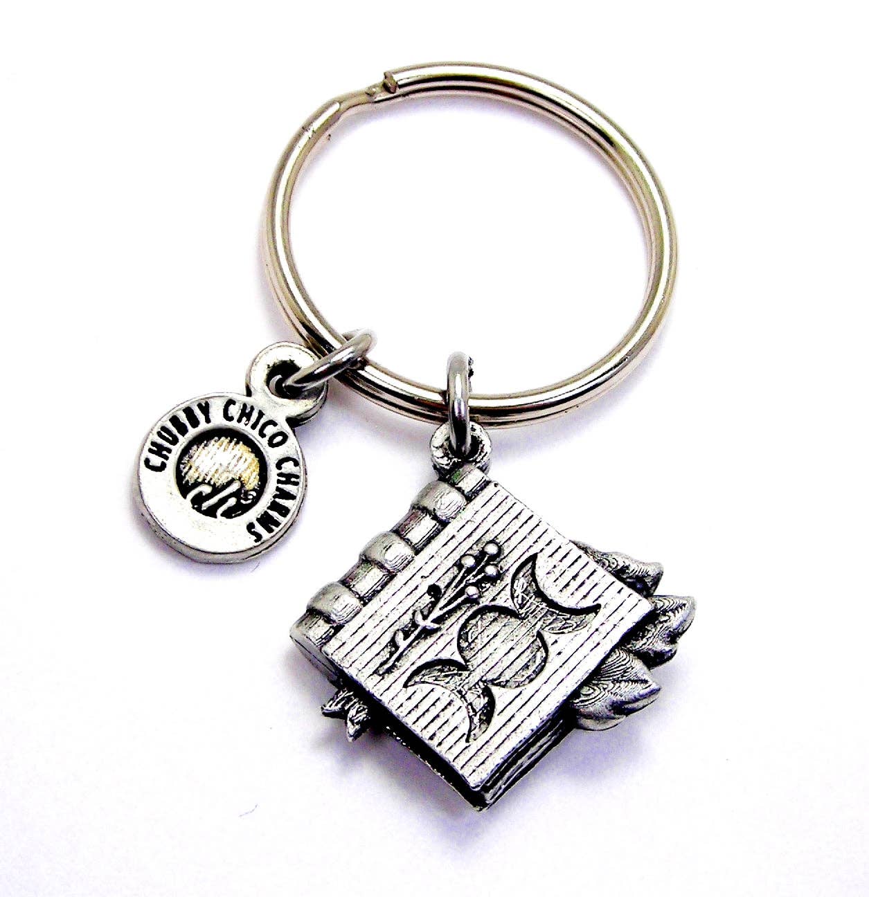 One of our 100% genuine American pewter charms hung from a steel standard size key ring.