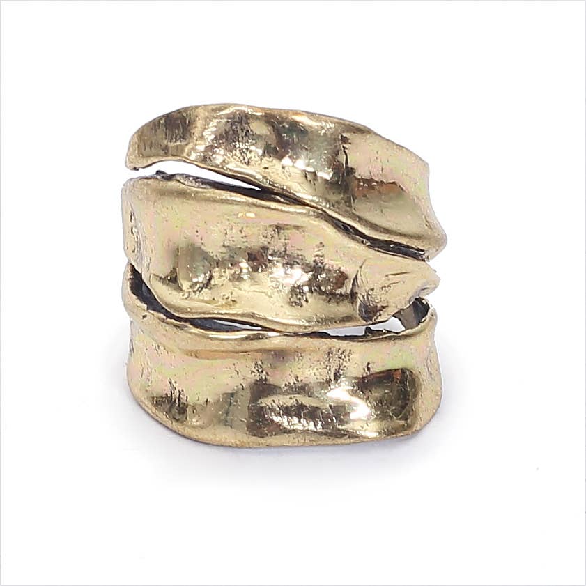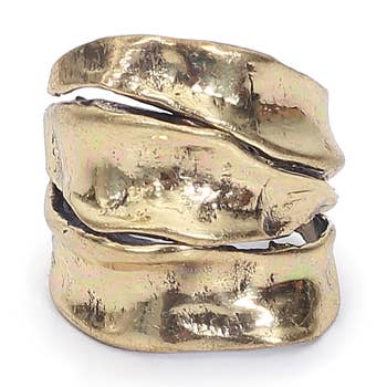 This highly visual ring of brushed gold ribbon adds a unique, personal touch to any hand. Give it as a gift to oneself or present it to a deserving other -- it's perfect for those occasions when you're searching for something truly special. Product details Materials: Pewter casting plated with 24 kt gold plating / Sterling silver plating. Measurements: 0.75" wide.