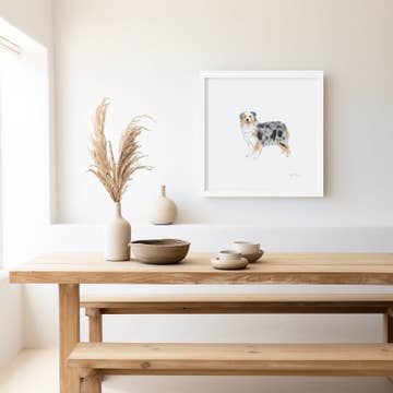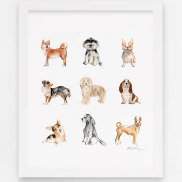 Dog party! Each dog was hand painted individually in watercolor and this is a reproduction of the originals. This fun print will be a lovely addition to a hallway wall, kids room, bathroom, or play room. --- Material - bright white ultra premium matte paper. Packaging - clear cello sleeve, backing board, mini business card.