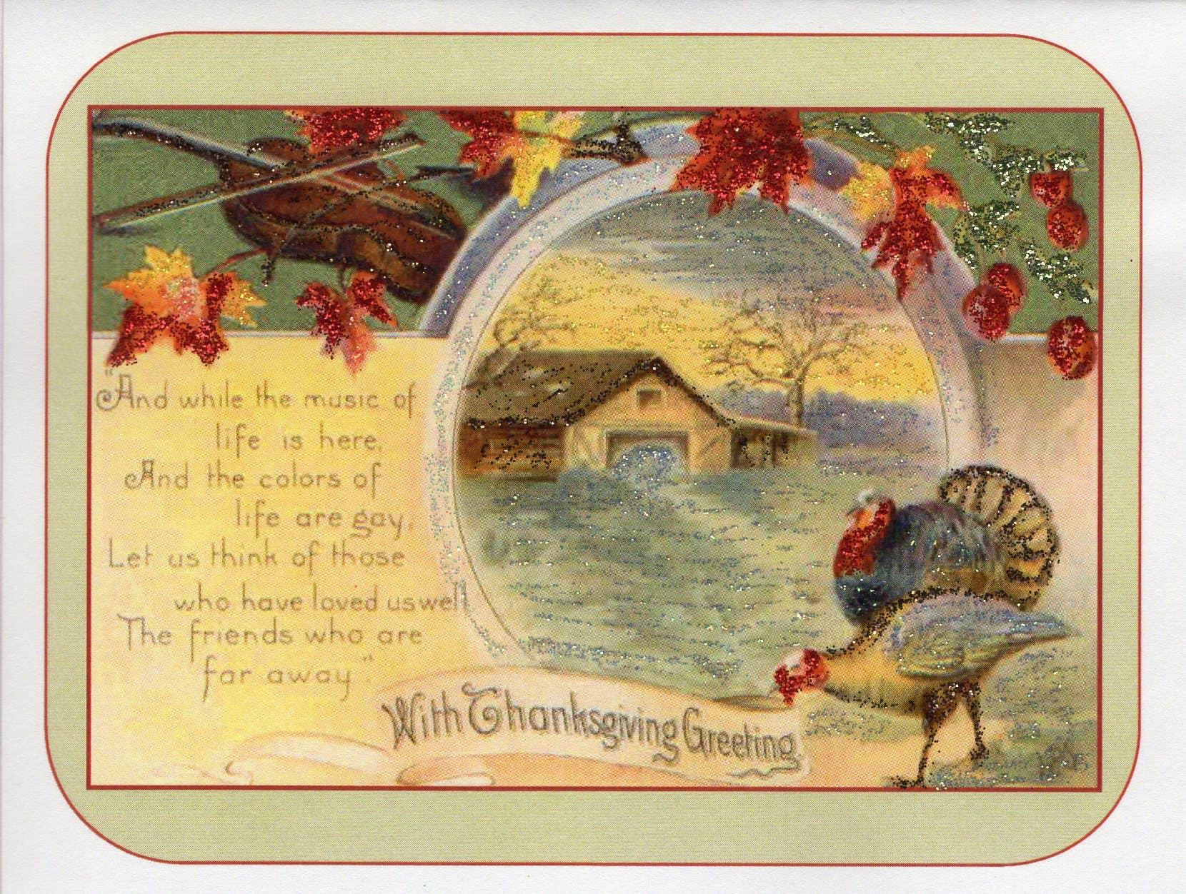 A large wild turkey graces the front of this 5" x 7" greeting card. He is standing in a large countryside, framed by orange and autumn leaves. Hand-painted accents of sparkling glitter complete the colorful vintage image. The inside of this Thanksgiving card is blank, with room for a personal greeting or to include a photograph.