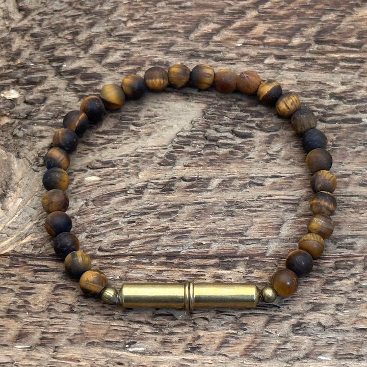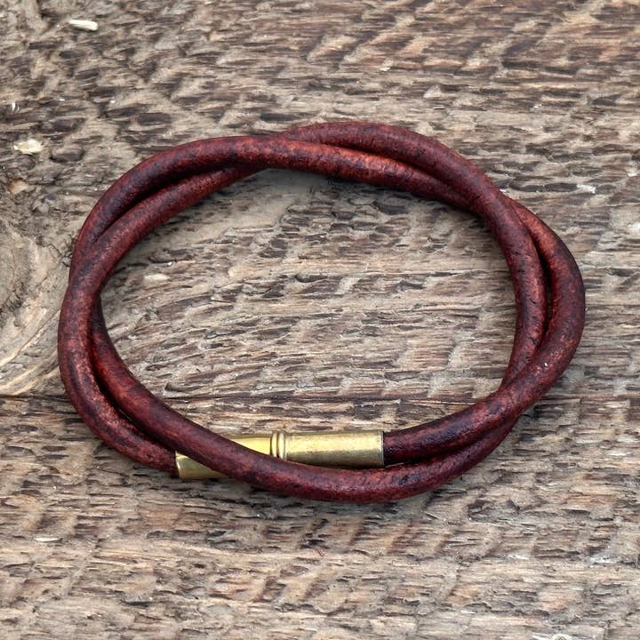 This limited-supply Flint Bracelet is made using repurposed, upcycled nickel plated.22 shells and strong magnets for an authentic and rustic look that goes with any style. Wearing two of any of the Flint Bracelets together with the magnetic clasps in alignment creates a well-organized, polished style.