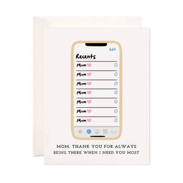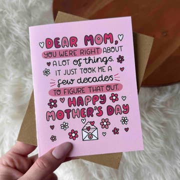 SKU: MOM 006 Made in United States Card Count: 1 Color: Pink and White Finish: Matte Is Set: Individual Occasion Theme: Mother's Day Recipient: Parents Special Feature: Blank Theme: Family & Friendship Tone: Funny Product Language: English Weight: 13.61 g (0.48 oz)