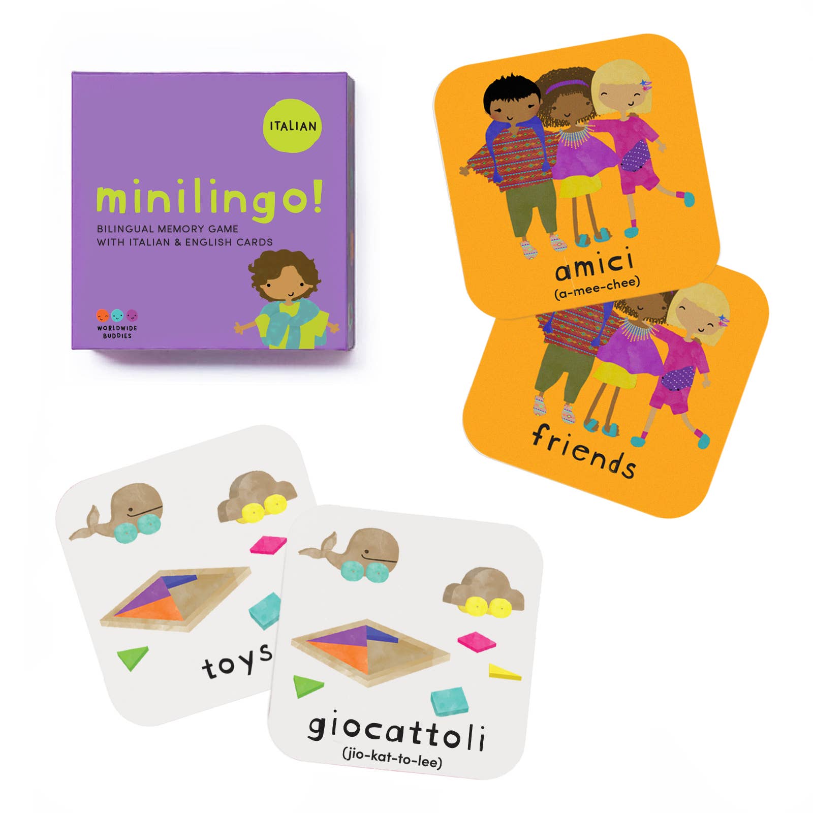 Spanish/English bilingual flashcards that can that can be used for playing memory and snap, or as simple learning flashcards. These versatile cards are perfect for language learning through play and to enhance children's Spanish or English vocabulary. Each minilingo includes 42 flashcards featuring simple images with words and their phonetic pronunciations, making them the ideal language learning resource for kids. Minilingo is a trusted choice for parents and educators, and a playroom must-have! Features: - 42 bilingual flashcards (21 pairs) - Simple, colorful images with words and pronunciations - Dimensions: 3.4 x 3.4 x 1.1 - Award-winning: A Family Choice Award Winner and National Parenting Center Award Winner - Available in 11 language combinations - Compact and portable, they are ideal for learning on the go - Support children's language development and memorization Great for shops that sell educational games for kids, Easter and holiday gifts, bilingual flashcards, flashcards for toddlers, interactive learning cards, educational toys and Easter basket stuffers.