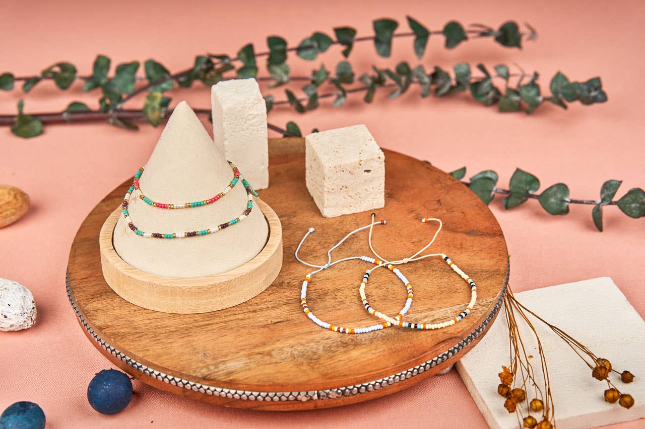 SKU: 3795 Using renewable resources such as Acai seeds, Tagua Nuts, and achira seeds. Accents include glass/brass-colored beads and charms. Beautiful colors and designs to match any outfit! Some designs available with brass or Tagua Nut charms to enhance the beauty of the piece! Product Details Handmade by Artisans in South America. Very competitive prices. Original designs. Made from renewable, sustainable materials that benefit the Amazon Rainforest. Cohesive collection. Ideal gift. Handmade by artisan communities in Ecuador. Sold in case of 4 items- cases come in an assortment of unique styles and fun colors Material content: Tagua nut, acai and achira seeds, glass beads, elastic cord.