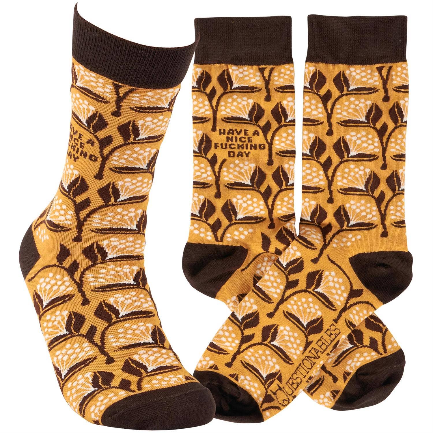 Oh, sorry. Just ran out... try again tomorrow. This pair of colorful socks flaunts a vibrant retro inspired pattern with a sassy sentiment that reads "Fresh Outta Fucks." Questionables socks are made with cotton, nylon, and spandex to create a one-size-fits-most design. Packaged on a clear plastic hanger with header card for graceful display in store. Our Fresh Outta socks call back to a retro style while also calling out a modern mentality, perfect for making a statement while getting a giggle out of others. Colorful and cozy socks always make a great gift that offer many ways to express themselves every day.