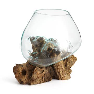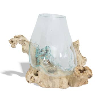 Skilled artisans in Bali, Indonesia use recycled glass to hand blow this beautiful one of a kind glass vessel directly on top of Gamal root bases. This wood otherwise scraps from the hardwood furniture industry. As a result of the organic nature of the product, there are no two exactly the same. Some have larger wood, some have a larger glass. Slight imperfections in the glass are a result of the primitive hand-blown nature of the product. Because Cohasset works directly with the Balinese artisans who craft this product, our quality is top-notch. Not all sellers of these products have the same quality standards.