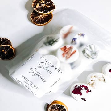 These come labeled with our labels and include a variety of shower steamers with different fragrances and floral options. You will not be able to pick which scents we include in your order. Each packet containers 15 round circle shower steamers To Use: Turn your shower into a spa by using one of our shower steamers. Lay this tablet on the bottom floor of your shower and turn your water to its hottest setting while closing the door of your bathroom. Allow the tablet to dissolve halfway before entering the shower. Do not put shower steamer directly into the water stream because it needs steam in order to dissolve the proper way. This would make the perfect gift for anyone, or even bridal shower favors as well. You will get to select your scent at check out. Our variety set includes random fragrances that we have in stock at the moment. Ingredients: baking soda, citrus acid, cornstarch, distilled water, fragrance oils, Epsom salt, Almond oil