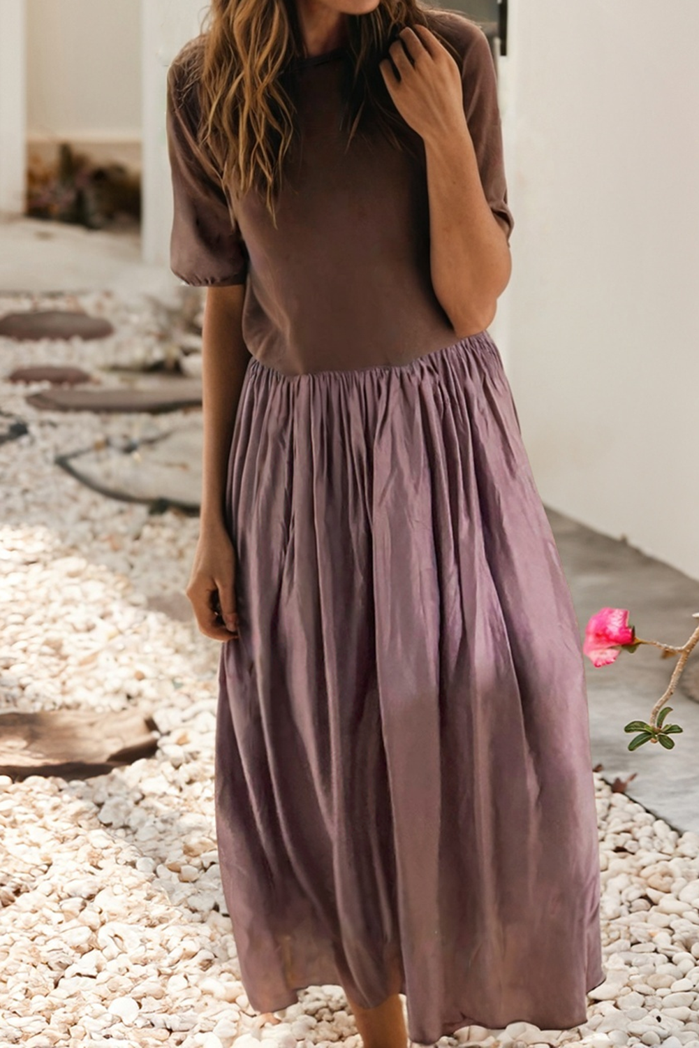 Made in United States Aesthetic: Casual and Romantic / whimsical Care Instructions: Machine wash Fabric: 67.5% Rayon, 29% Nylon, 3.5% Spandex. Fit: Contemporary Occasion Theme: Everyday Occasion: Everyday Pattern: Solid Season: Spring/Summer Skirt & Dress Length: Midi Sleeve Length: Short Sleeve Weight: 181.44 g (6.4 oz)