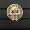 Elevate your decor with the plaster Squatting Gargoyle Wall Plaque – a conversation-starting centerpiece that will leave a lasting impression. Has a metal wire hook for easy hanging. Material: Plaster Color: Stone Wash - (beige and black weathered paint wash) - since each piece is finished by hand, colors may vary slightly Dimensions: 3.5" diameter x 1.3" H Made in the U.S.A.
