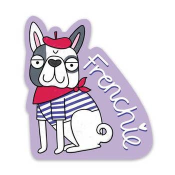 Pre-bundled in 12 packs. Suggested retail: $3.95 per sticker 2.81” W x 2.83” H Matte finish and water resistant Made in the USA We believe in everyday art. That's why we make stickers. Affordable, super fun, expressive, a great memento, and a stellar conversation starter. With stickers, the world is your gallery. Keywords: sticker, stick, em, gift, made in usa, vinyl, dog, canine, doggie, doggy, doggo, french, bulldog, frenchie, baguette, bread, roll, beret, hat, smiling, blue, feelin, feeling, heart, neckerchief, handkerchief, bandana, spotty, spot, spots, spotted