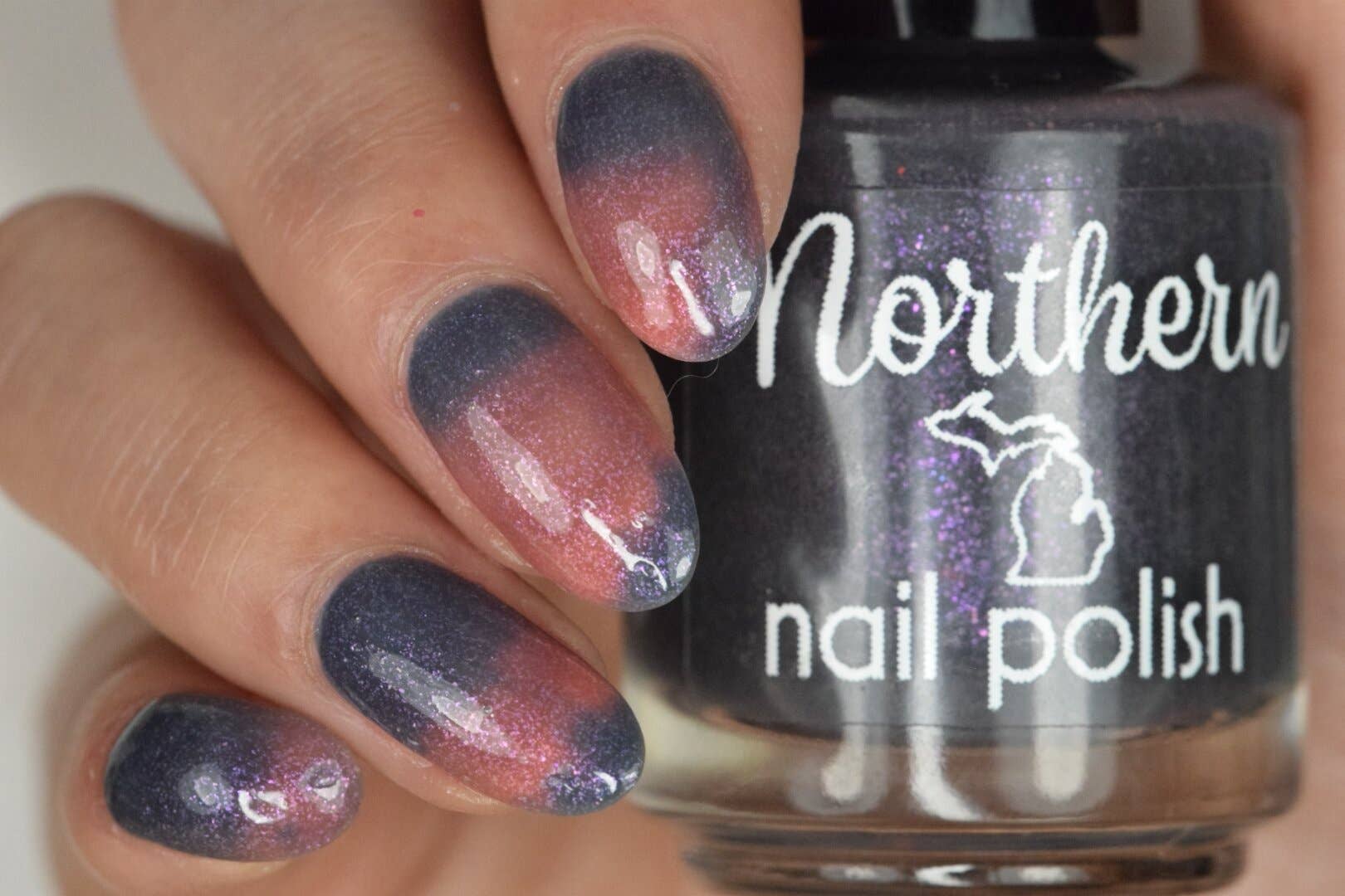 Dearborn ~ Mood Color-Changing Tri-Thermal Nail Polish Changes colors in different temperatures! In the cold state, it is holographic charcoal blue. In the warm state, the polish lightens up to denim blue. When at it’s warmest, the polish is a lavender color! 15mL standard large nail polish bottle size, State-neutral front branding labels for non-Michigan boutiques. "Sample/testers" are only for the optional, reusable swatch rings attached to the top of the bottles - not an additional bottle. Northern Nail Polish: ~ Non-toxic ~ Natural, Vegan Ingredients ~ Cruelty-Free Formula ~ Chip-resistant & Long Lasting ~ Non-staining, Easily Removed ~ Great Customer Service ~ Handmade in Michigan Ask about a free display rack when you order 60+ bottles!