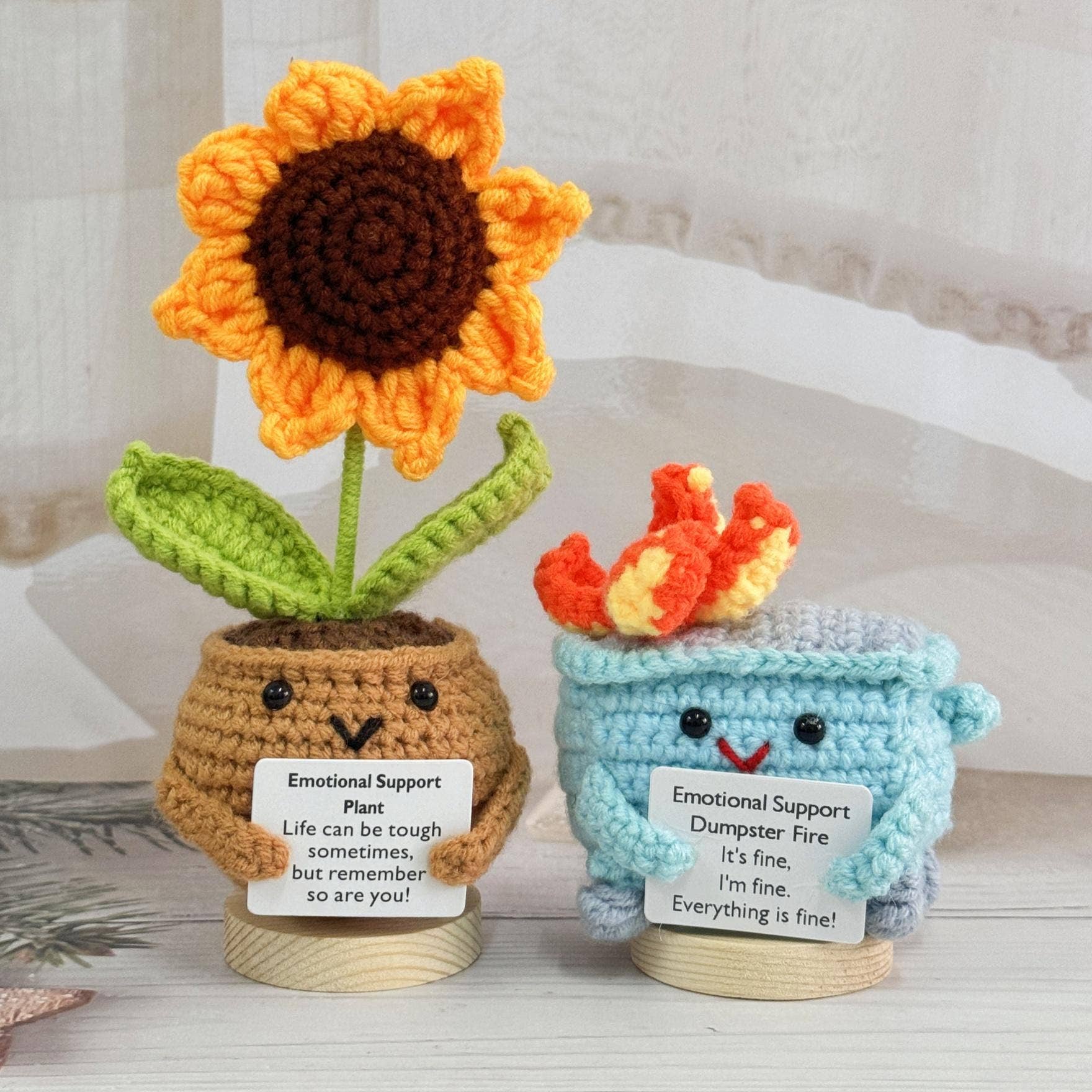 Crochet Emotional Support Plant, Sunflower/Daisy/Rainbow Flower No base Set of 1 piece Size: Approx. 12 cm tall Please note: - Due to the handmade nature of this product, slight variation in yarn texture, and malleability of the finished plush, size may vary slightly. - The texture of the yarn may vary slightly between colors (even though many of them are the same brand!).