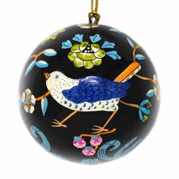 Paper Mache, hand painted. This delightful Bird Paper Mâché Ball Ornament brings a touch of nature and handcrafted charm to your holiday décor. Made from layers of paper and paste molded over a round form, each ornament is lightweight yet sturdy, with a smooth, hand-painted finish. Beautifully decorated to resemble a colorful bird, the ornament features fine painted details such as feathers, eyes, and beak, capturing the grace and personality of your favorite songbird. A loop of ribbon or twine at the top makes it easy to hang on a Christmas tree, wreath, or in a sunny window. Each piece is one-of-a-kind, showcasing the warmth and artistry of handmade craftsmanship — a perfect addition to rustic, woodland, or nature-inspired décor, and a thoughtful gift for any bird lover. Size: 3" Handmade in India