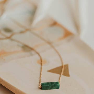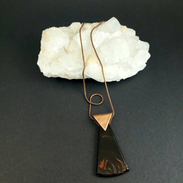 Etched copper or bronze and emerald quartz talisman on either a 21” or 28” copper snake chain. Please be aware that due to the nature of stones they may vary in color etc. making each one unique.
