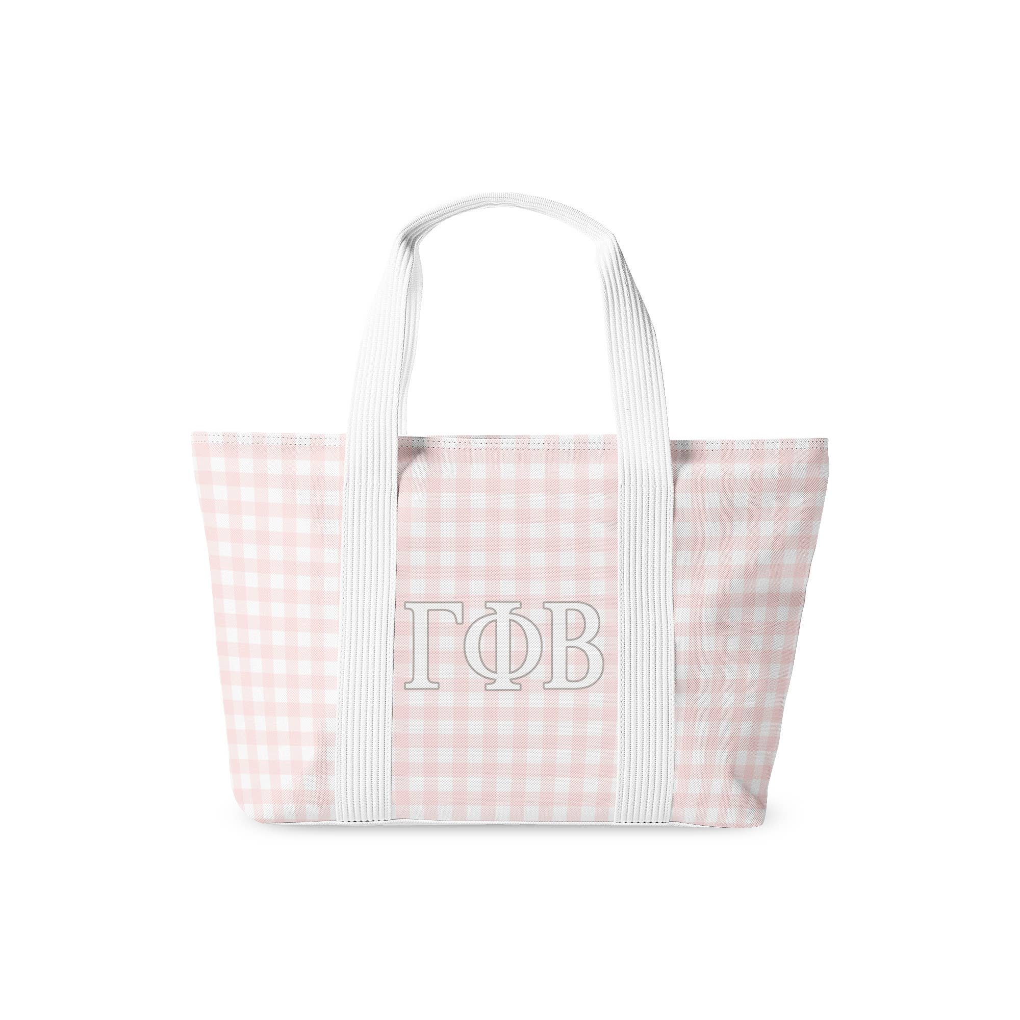 OFFICIALLY LICENSED BY PI BETA PHI AND AFFINITY LICENSING Our Pi Beta Phi tote bag is the perfect mix of classic charm and sorority spirit. Featuring a soft blue gingham pattern and eye-catching pink embroidered Greek letters, this bag is as cute as it is practical. With three interior pockets, it’s ideal for staying organized whether you're running errands, headed to chapter events, or packing for a weekend getaway. -19x12x5 inches Black, red, AOII, sorority, bid day, basket, big, little, sister
