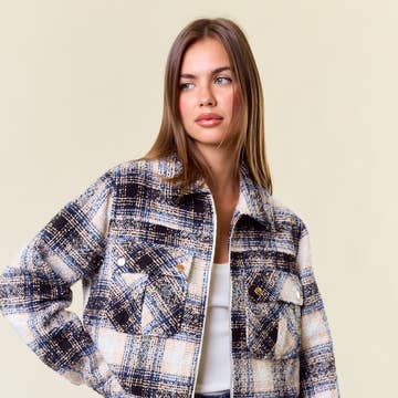 Textured Plaid Collared Neck Jacket - 10611J-1