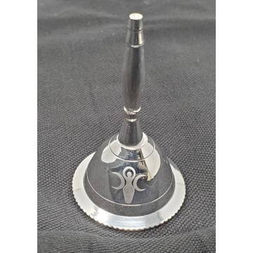 Description : About 3'' high. Silver color Design Triple Moon, Pentacle & OM Ring this altar bell to mark beginnings and endings and clear the area of negative energies! Small and portable brass brings style, sound healing, and cleansing to your sacred space. An altar bell is used to invoke the Goddess in ritual. The gentle tones and vibrations a bell makes are very powerful for bringing in good energies as well as transmuting "negative" into more positive energies.