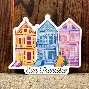 Victorian house, hand-colored block print. The Pink Lady sits across from the Carson Mansion. Together, they make up the two most recognizable houses in Eureka, California. From Lynn M. Jones’ original linoleum block carving. Sticker printed in Fortuna, CA. Full color on opaque white vinyl with matte laminate. Outdoor safe. 3.37" W x 4" T Victorian, house, mansion, vinyl, sticker, pink, architecture, Eureka, Humboldt, Northern California, redwood, laptop, water bottle, decoration, linocut