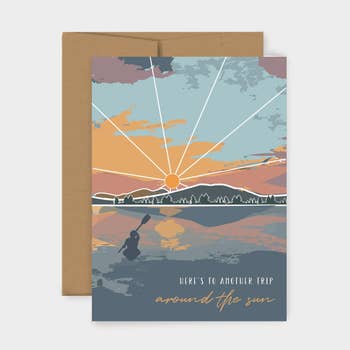 "Here's to another year around the sun." As a environmentally conscious business, we try to cut out plastic where ever we can. PLEASE CHOOSE Yes/No on BOTH questions. Do you feel the need to use a plastic sleeve or not. Thank you. This card is an A2 size (4.25"x5.5), digitally printed on high quality 100% recycled #80 white felt cover stock. The paper provides a watercolor paper texture and is paired with a 100% recycled craft paper envelope. It is blank on the inside.
